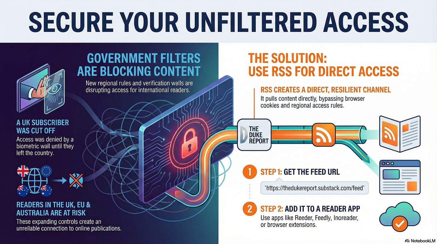 A subscriber in the United Kingdom reported an access blockade that cut off every post from The Duke Report. A government-mandated age-verification wall demanded biometric submission and prevented normal viewing. Access returned only after the subscriber left the UK and updated their payment information to a euro-based account. This experience signals a wider concern for readers in the UK, the EU, and Australia. Government filters now shape access to online publications, and these controls expand in unpredictable ways. A reliable fallback channel strengthens our connection when platforms face external pressure.