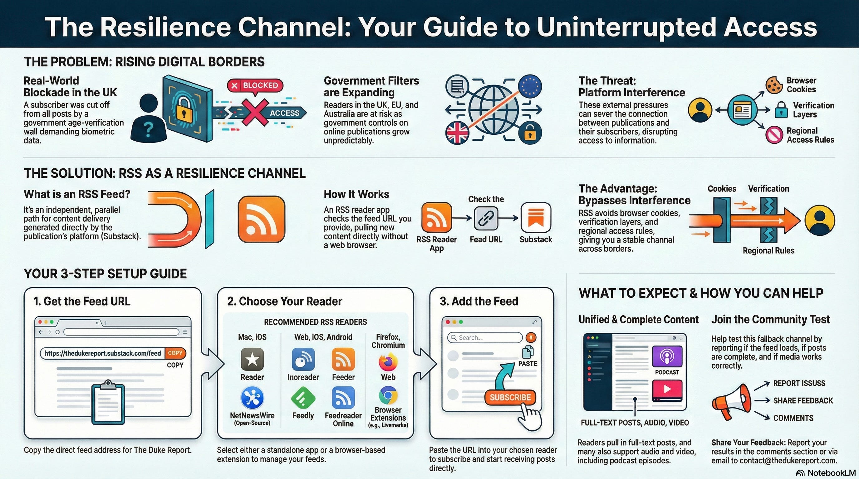 RSS readers check feeds at regular intervals, retrieve new entries, and present them in a unified dashboard. Many readers load the full text of each post. Several readers also support audio and video enclosures, which allow podcast episodes and embedded media to appear directly in the reader. This channel strengthens continuity when platforms introduce regional gates or identity requirements.