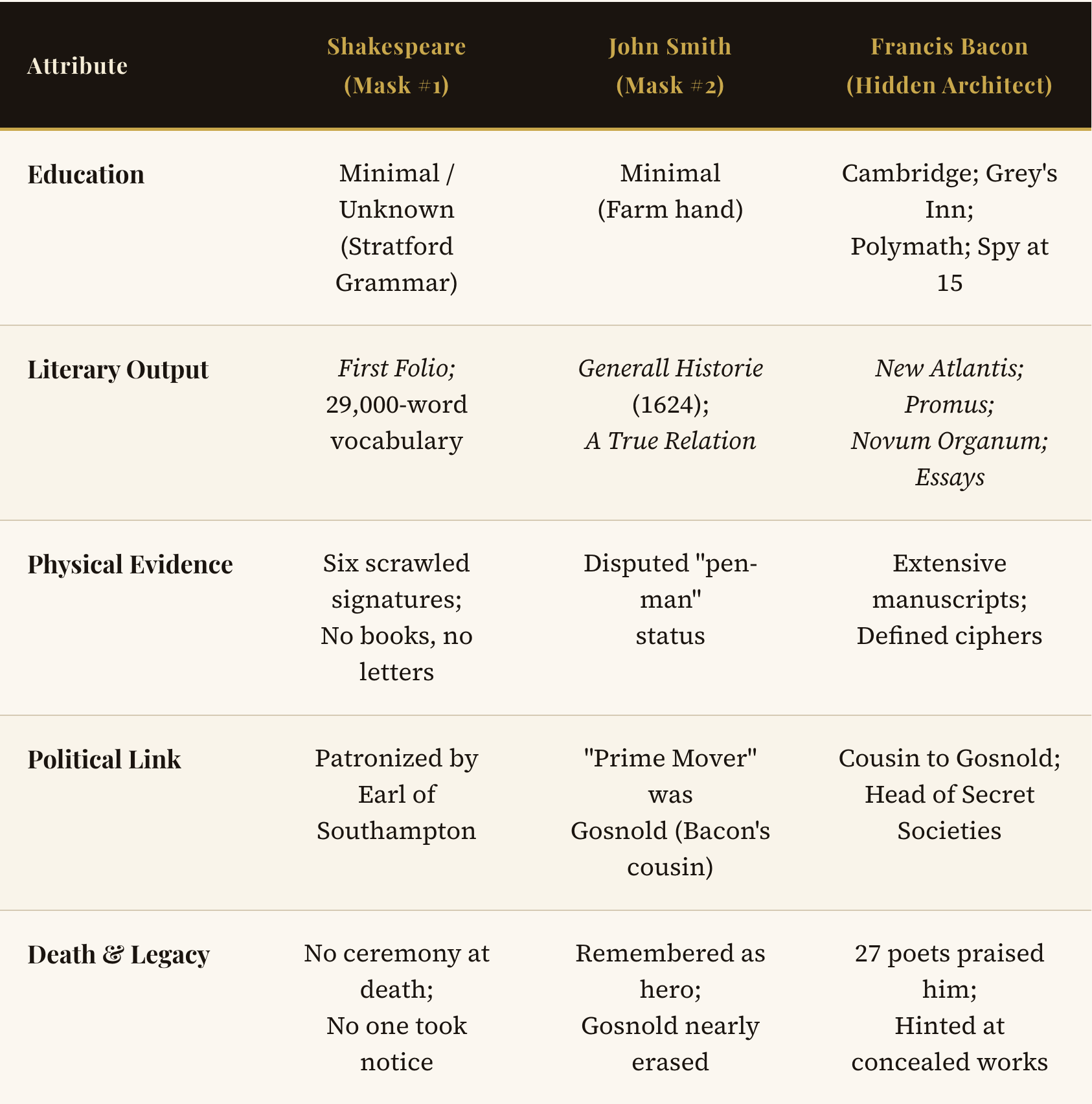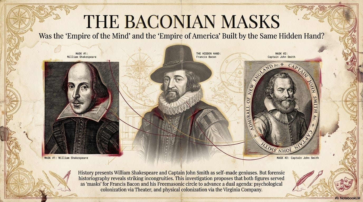 History presents William Shakespeare and Captain John Smith as self-made geniuses. But forensic historiography reveals striking incongruities. This investigation proposes that both figures served as “masks” for Francis Bacon and his Freemasonic circle to advance a dual agenda: psychological colonization via Theater, and physical colonization via the Virginia Company.
