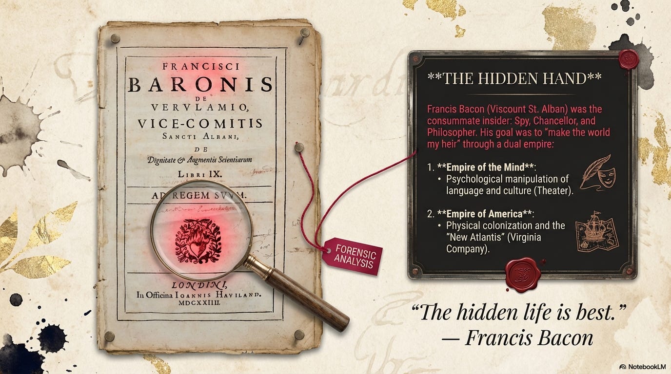 Francis Bacon (1561–1626), Viscount St. Alban, was the consummate insider: spy, Chancellor, and philosopher. His stated goal was to “make the world my heir” through a dual strategy of intellectual and territorial empire. By the age of 15, he had mastered Greek, Latin, French, Hebrew, Spanish, and Italian, had read the entire classical canon in the original languages, and had already begun his career in espionage under spymaster Sir Francis Walsingham.7