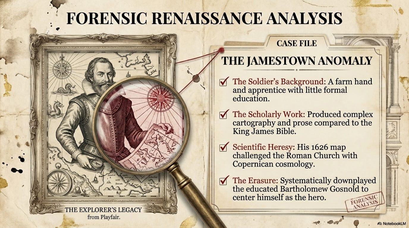 His 1626 map contained Copernican cosmology that challenged the Roman Catholic Church, requiring the education of a university scholar, not a farmhand. Most critically, Smith systematically downplayed the role of Bartholomew Gosnold — the Cambridge-educated, legally trained “prime mover” of the Jamestown settlement — to center himself as the founding hero.6