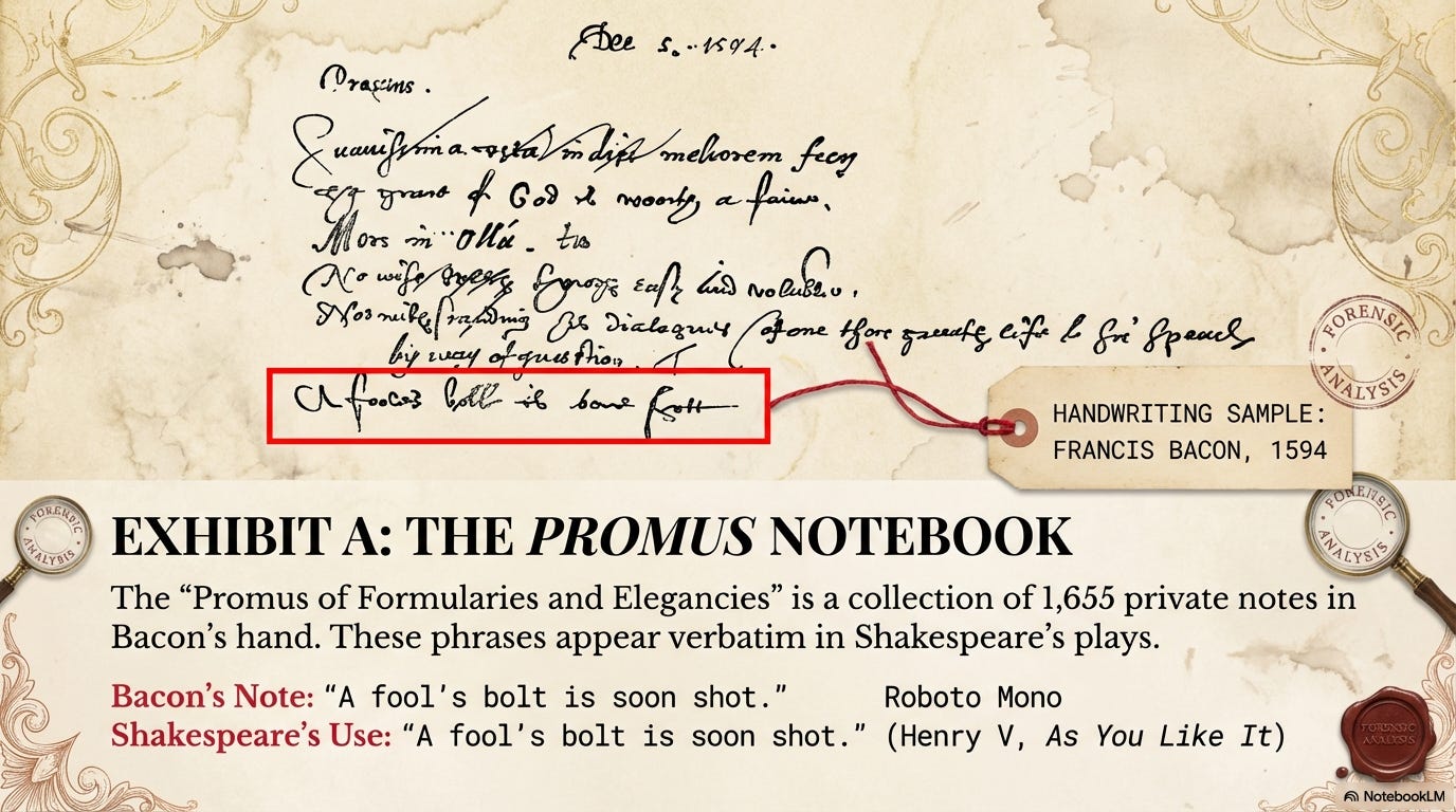 The Promus is a private collection of 1,655 phrases in Francis Bacon’s own handwriting, compiled c. 1594 and now held in the British Museum (MS Harley 7017). These exact proverbs and unique turns of phrase appear verbatim throughout the Shakespeare plays — sometimes word-for-word, sometimes adapted.10