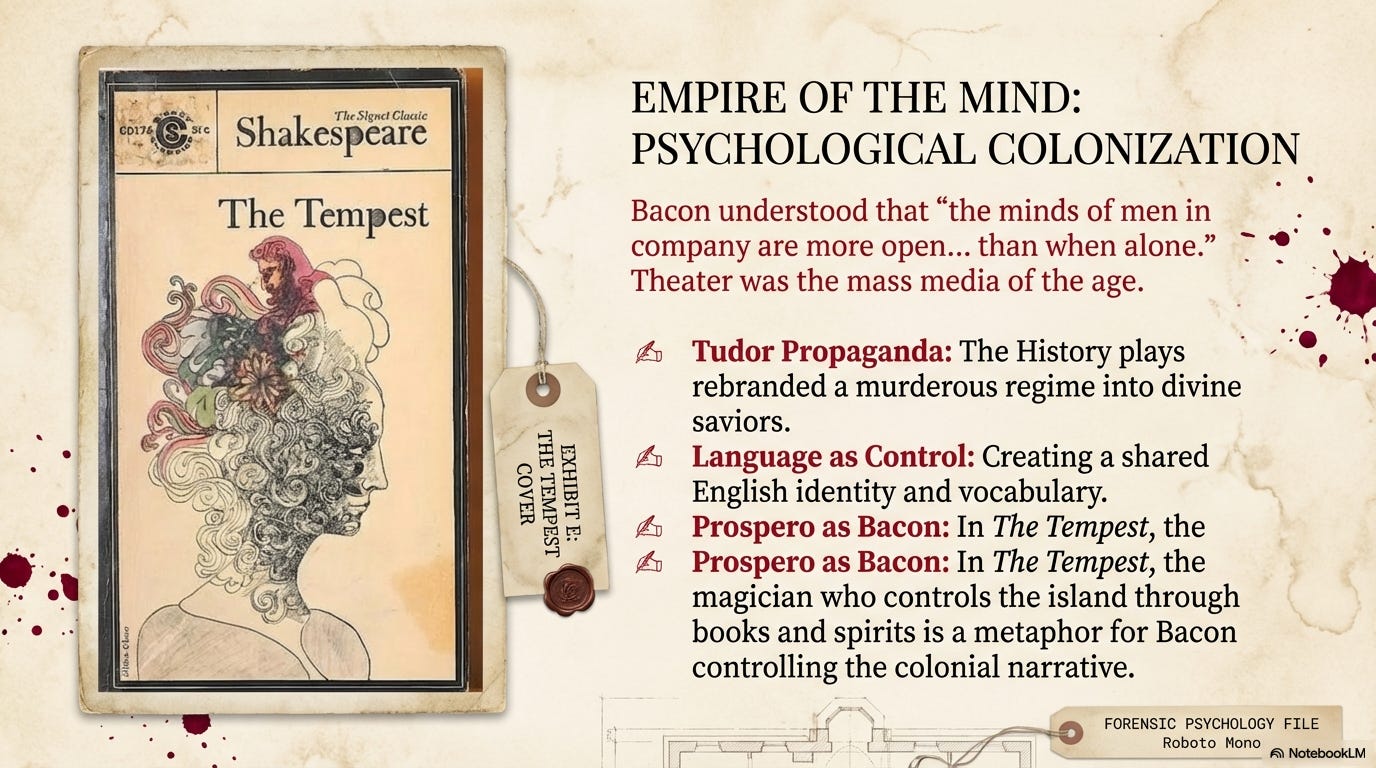 Through Shakespeare's plays, the English language was refined from what Robert Frederick calls “an underdeveloped, guttural stepchild of German” into the richest, most flexible language in the world — a prerequisite for global empire.18 The History plays rebranded the Tudor regime as divine providence; The Tempest‘s Prospero — the magician who controls an island through books and spirits — served as Bacon’s self-portrait of the philosopher-king controlling the colonial narrative. Theater was the mass media of the age, and Shakespeare was its instrument.
