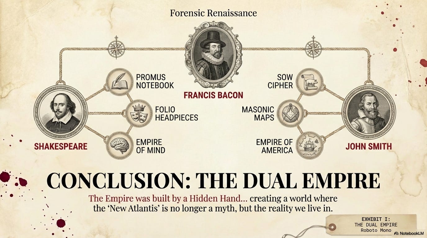 The secret network was responsible for the publication and promotion of a specific suite of works designed to reshape the world: the Authorized King James Bible (1611), the Shakespearean plays, and the works of John Smith. These were the three pillars of a philosophical “planting” of Baconian ideals — spreading Protestantism, English cultural dominance, and the empirical method across the globe.