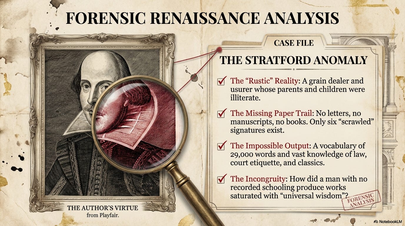 The primary evidence for this “Impossible Genius” strategy lies in the staggering paradoxes surrounding the era’s most famous names. In literature, history presents the “Stratford Man,” an uneducated grain dealer from a family of illiterates, yet attributes to him the First Folio — a work requiring an unprecedented vocabulary of 29,000 words and intimate knowledge of international law and courtly life. A mirror image appears in the colonial record: Captain John Smith. Nominally a farm hand with limited schooling, Smith is credited with The Generall Historie, a text of such scholarly depth and prose quality that it rivals the Authorized King James Bible.