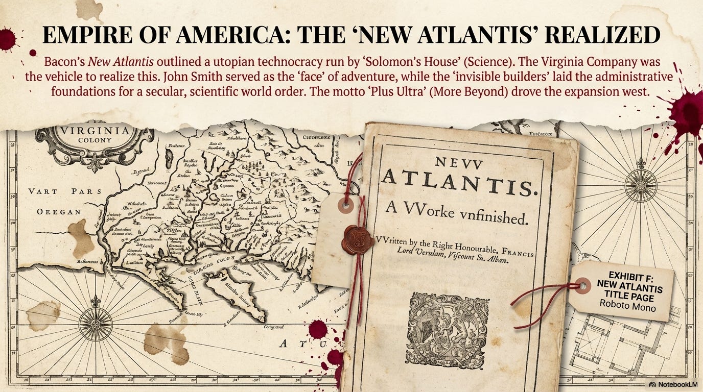 The Virginia colony represented the physical manifestation of the “georgic vision” outlined in Bacon’s New Atlantis (1627) — a utopian technocracy governed by “Solomon’s House” (science). This was not a pastoral or romanticized wilderness but a practical “georgic” project (after Virgil’s Georgics) of managing the estate of the world. Bacon sat on the board of the Virginia Company as lawyer and propagandist; his cousin Gosnold organized the Jamestown voyage; Gosnold’s wife’s cousin Sir Thomas Smythe funded and chartered the ships.19