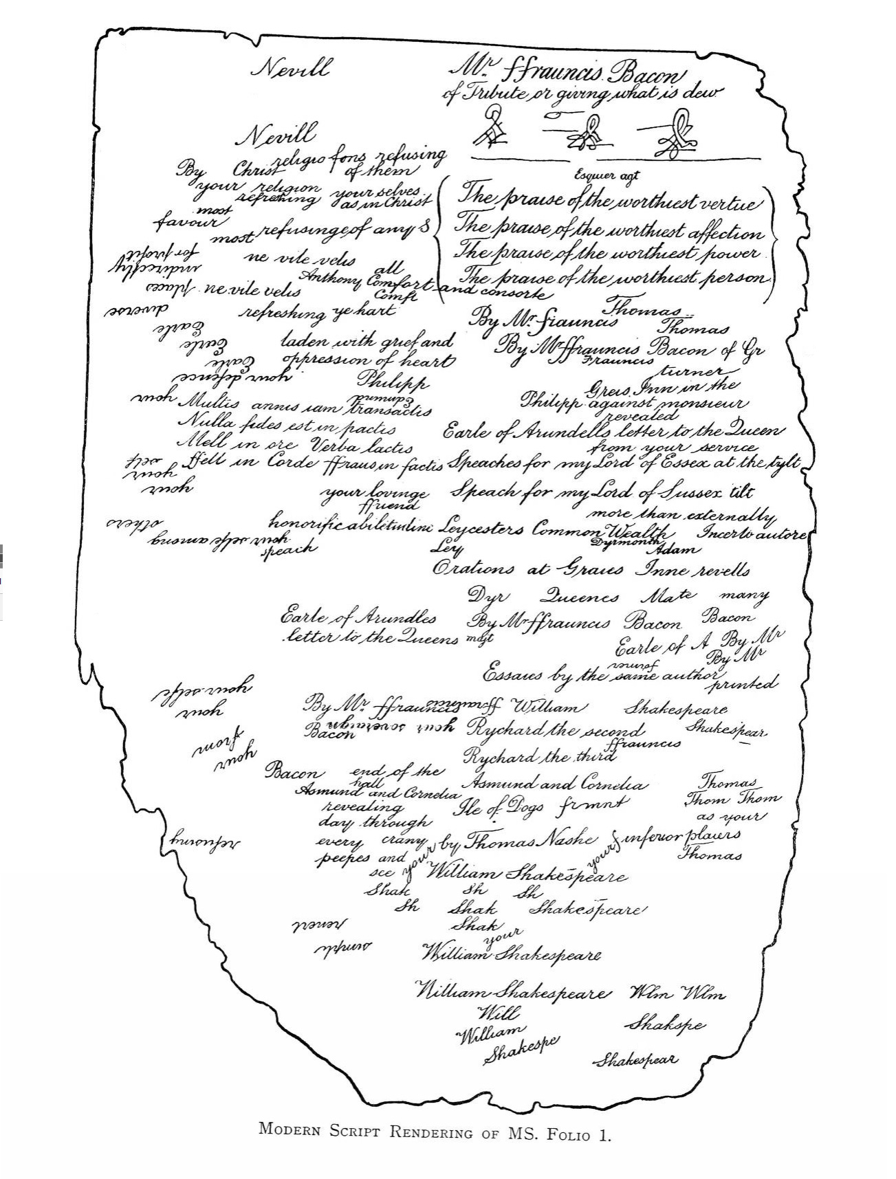 Not a single page of the original manuscript exists connecting the Stratford man to any play. One page of the Promus contains infinitely more evidence for Bacon’s authorship than exists for William Shakespeare of Stratford.