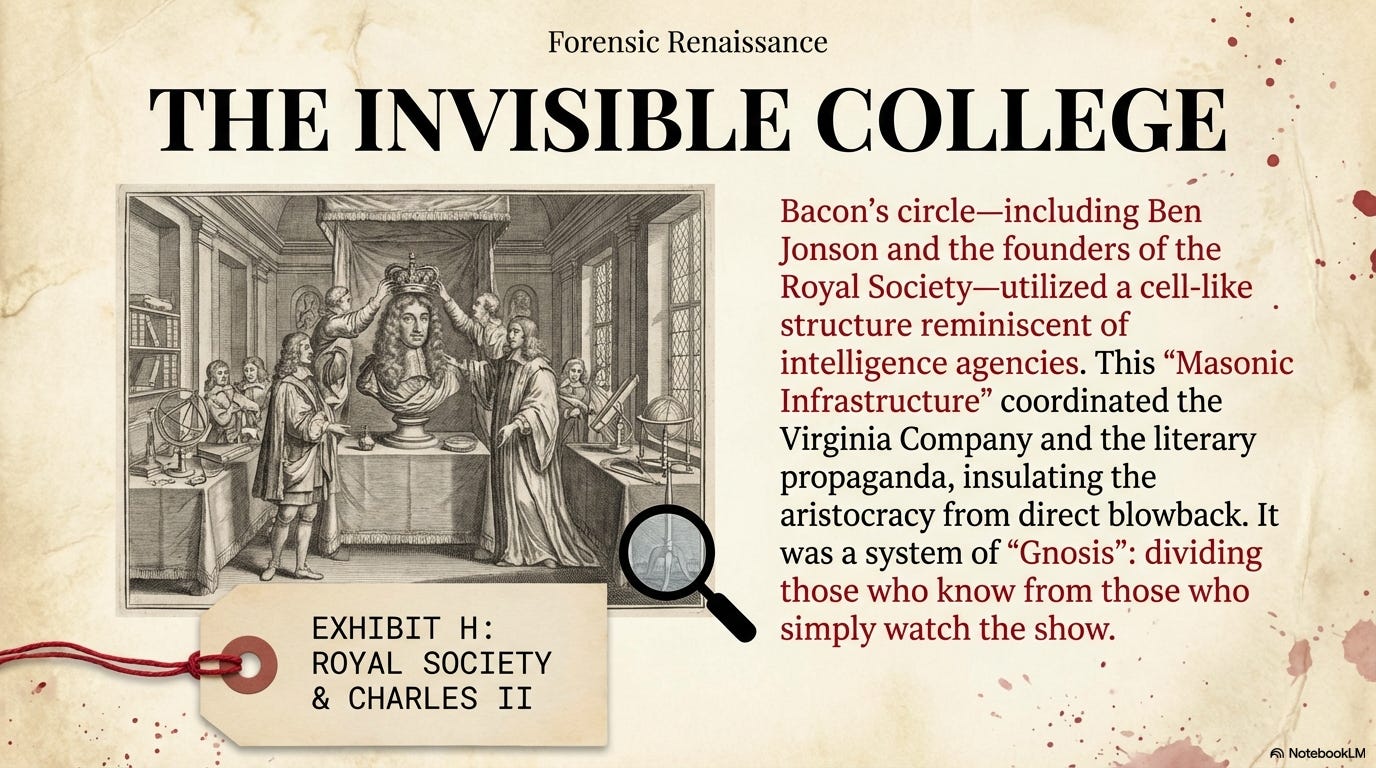 Rosicrucianism and Freemasonry provided this infrastructure. Bacon’s circle — including Ben Jonson and the founders of the Royal Society — utilized a cell-like structure reminiscent of intelligence agencies. This “Masonic Infrastructure” coordinated the Virginia Company and the literary propaganda, insulating the aristocracy from direct blowback. It was a system of “Gnosis”: dividing those who know from those who simply watch the show.