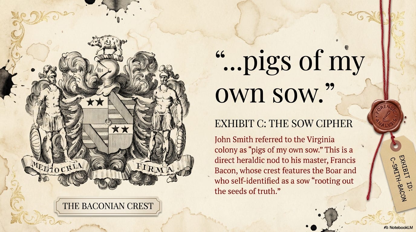 Smith referred to the Virginia colony as “pigs of my own sow” — a direct heraldic nod to Bacon’s family crest, which features a boar. Bacon self-identified as a sow “rooting out the seeds of truth.” Is this a coded acknowledgment of the master behind the mask?