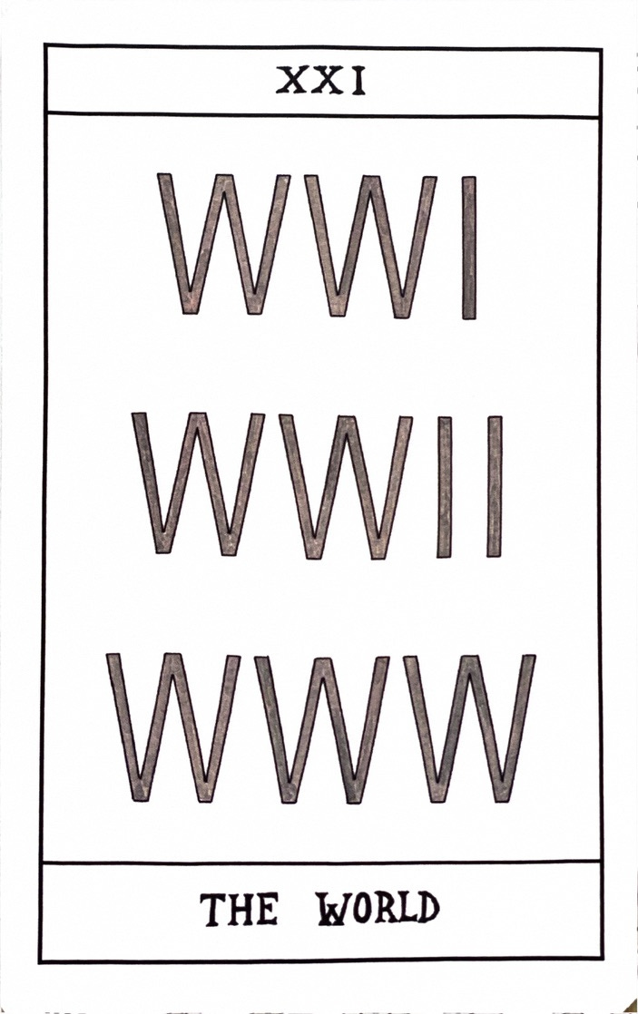 To illustrate the cultural dimension of this phenomenon, he references artist Suzanne Treister’s tarot deck created for CERN, which includes a “World” card labeled “World War I, World War II, WWW.” For Duke, this visual metaphor captures the transition from kinetic to cognitive warfare—the global web as the theater of the Third World War.