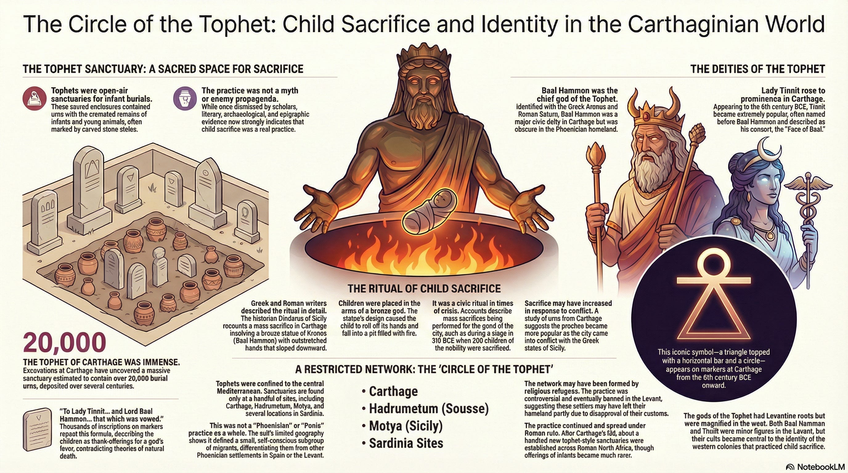Quinn’s osteological analysis indicates that the remains are those of healthy children, ranging in age from weeks to several years. Inscriptions on stelae function as transactional records, stating fulfillment of a vow after a god “heard the voice” of the supplicant. Duke applies that framework to the Heritage statue’s inscription: “The heritage of the past is the seed that brings forth the harvest of the future.” Within Tophet logic, seed names the child, and harvest names the prosperity secured through sacrifice. The statue stages an exchange through posture and objects.