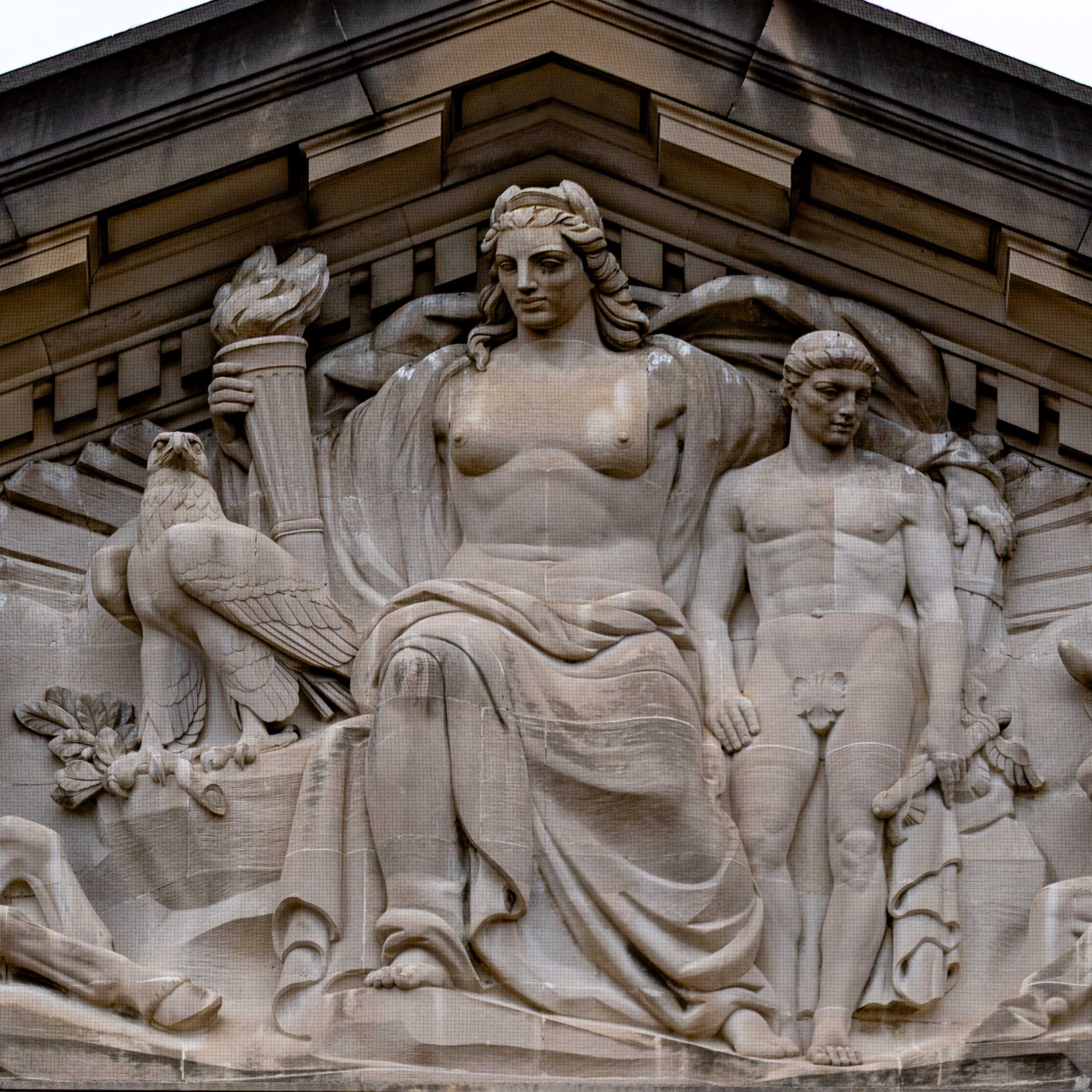 Duke frames his inquiry as a comparative visual analysis. He photographs architectural sculpture and places these images alongside artifacts documented in archaeological scholarship, particularly the work of the Oxford historian Josephine Quinn. This approach treats statues as semiotic, visual language, that is, a form of grammar. Meaning is conveyed by virtue of the arrangement of figures, objects, and symbols. Duke identifies repetition across sites that reads as continuity. What organizes these compositions, and why does that organization recur in Washington, D.C.?