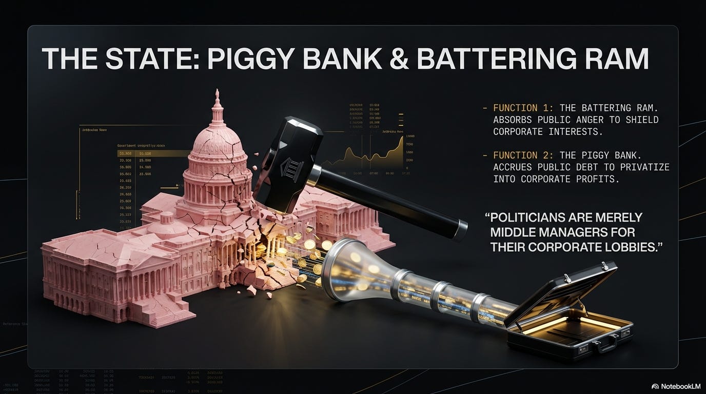 Dixon argues that governments function as tools for resource extraction, converting public debt into private profit. Bailouts, subsidies, and zero-interest mechanisms circulate government liabilities into corporate pipelines, enriching stakeholders aligned with the Financial Industrial Complex. Presidents and prime ministers operate within this structure as managers who coordinate spending and regulatory signals that match capital priorities. Dixon frames this structure as a closed-loop cycle between political authority and financial engineering.