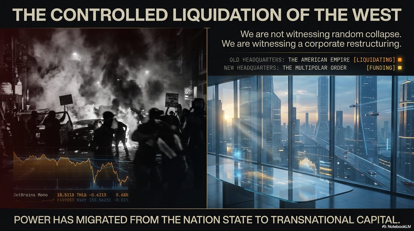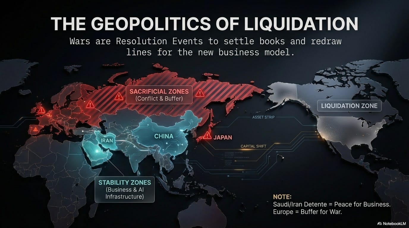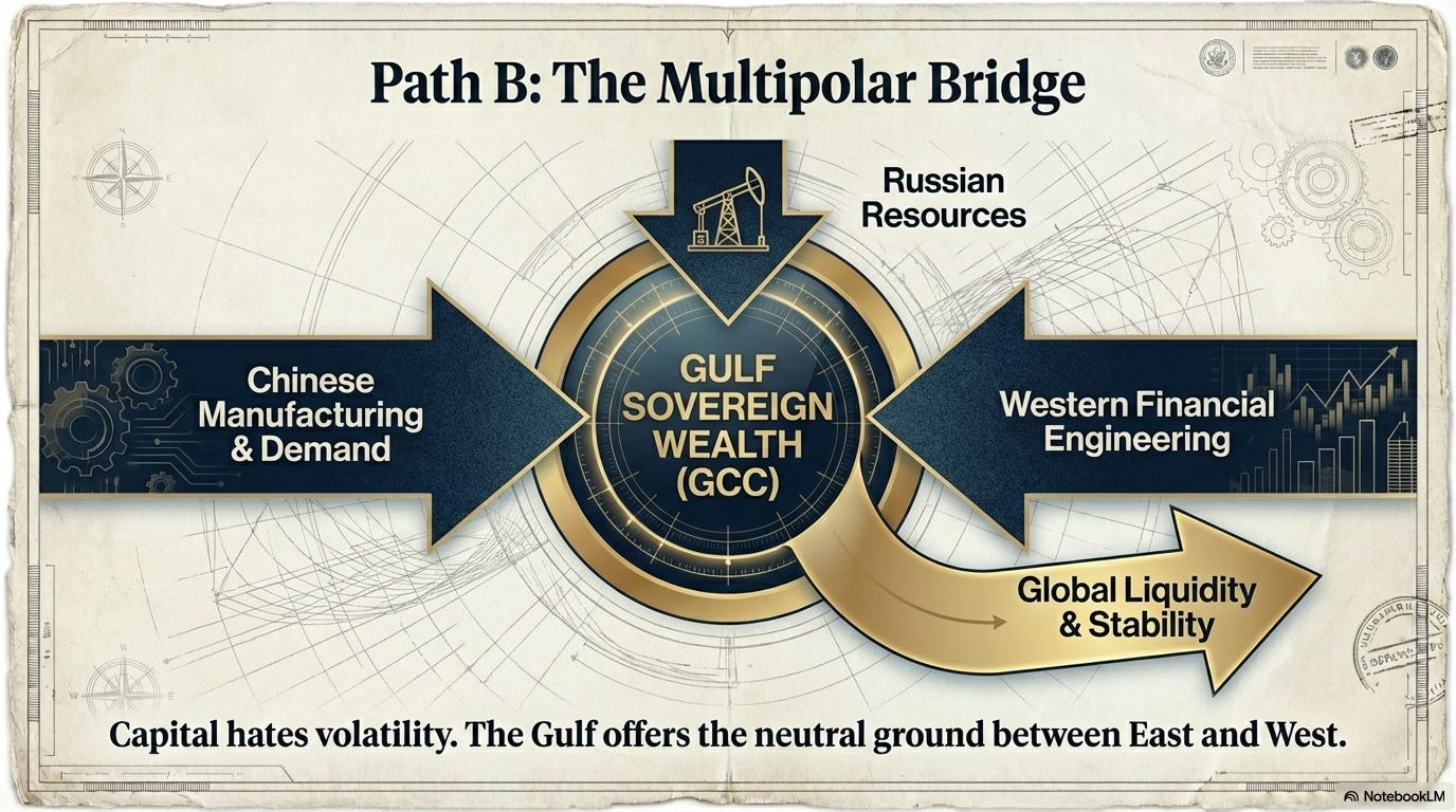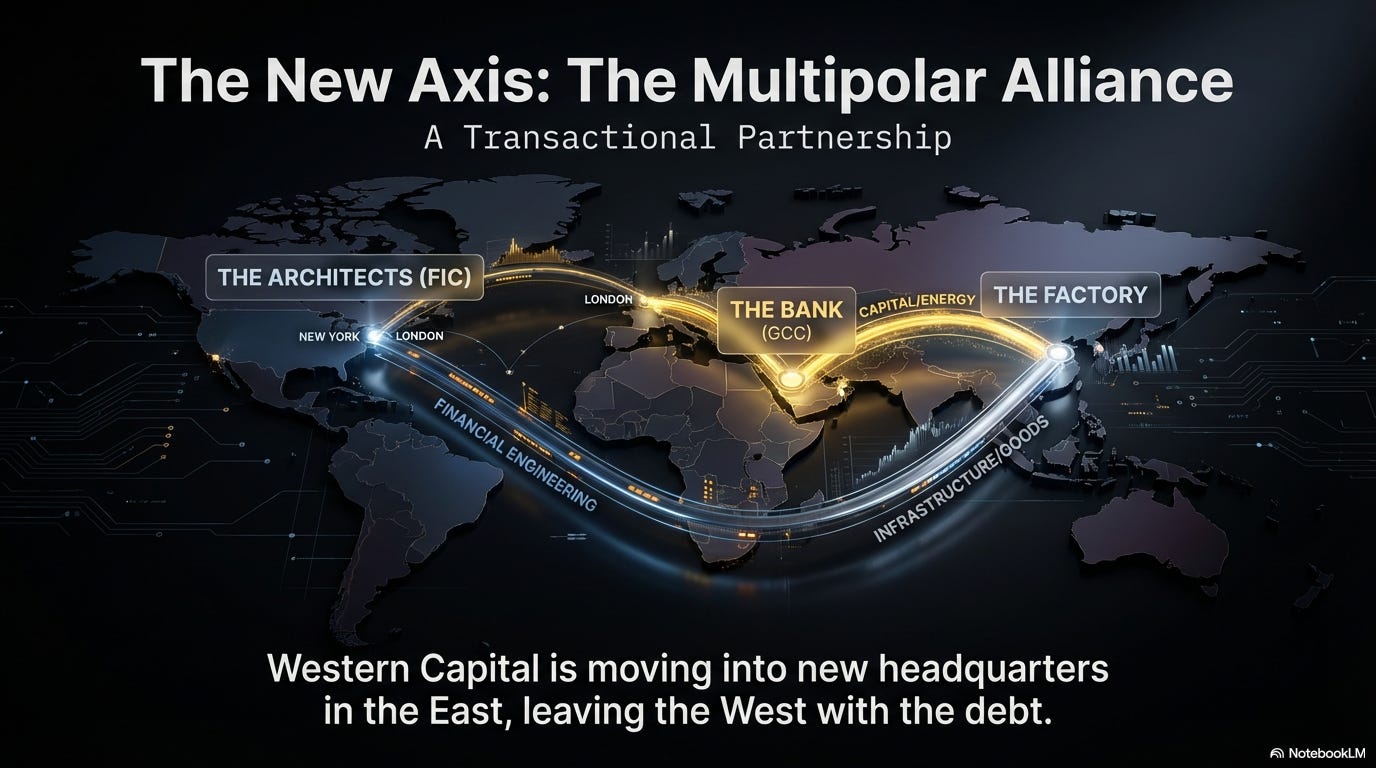 Dixon presents the decline of the U.S.-centered dollar system as a strategic asset migration. The Financial Industrial Complex pursues regional blocs that reduce military burdens and increase efficiency. The Western Hemisphere forms a unified resource zone for North and South America. China and Russia consolidate a Eurasian manufacturing and extraction region. Gulf sovereign wealth funds form the central financial hub that links Western capital to Eastern production capacity. Dixon cites megaprojects such as Neom as expressions of this partnership.