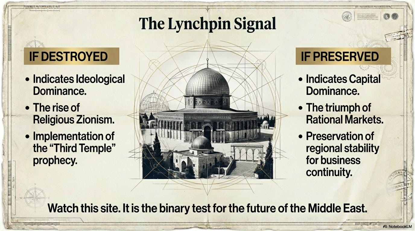 The test follows directly from these commitments. If the Dome of the Rock remains standing on the former site of the Second Temple, the outcome supports Dixon’s claim that financial logic shapes decisions at the highest geopolitical levels. If the Dome of the Rock is destroyed, Jiang’s ontology gains confirmation because the act reflects a cultural and civilizational momentum that overrides coordinated financial interests. Dixon elevates this to a decisive empirical question: financial coordination preserves the Temple Mount, and civilizational forces propel it toward rupture. The fate of the site that once held the Second Temple becomes the proving ground for which ontology governs global power.
