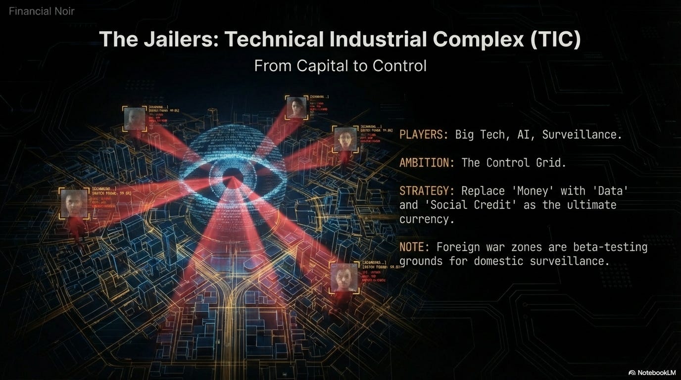 Dixon defines the Technical Industrial Complex as a rising system built around AI models, surveillance engines, digital identification frameworks, and programmable infrastructure. This system requires extraordinary capital access for data centers, robotics, and grid expansions, which places it under FIC direction in its present form.