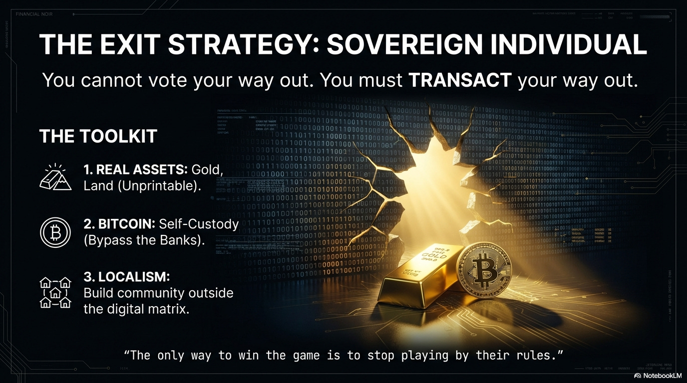 Dixon closes with a call for a financial boycott through self-custody, real assets, and strong local networks. He outlines the value of rural autonomy, community resilience, and coherent decision-making that reduces exposure to centralized grids. He encourages the movement of capital and attention toward local systems that strengthen sovereignty within the changing global architecture.
