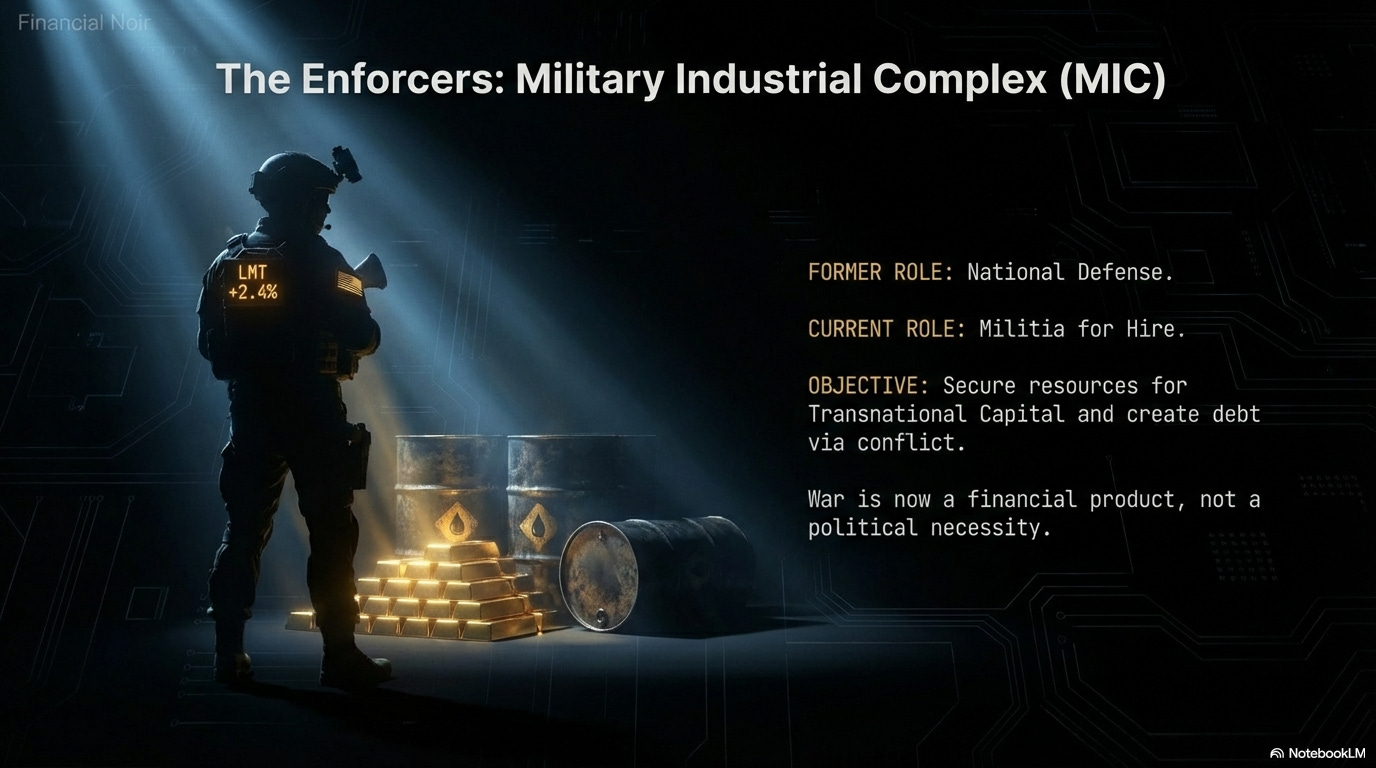 Dixon situates the Military-Industrial Complex beneath the Financial-Industrial Complex. The MIC historically shaped regional instability to reinforce dollar dominance, strengthen U.S. capital inflows, and open channels for IMF debt.