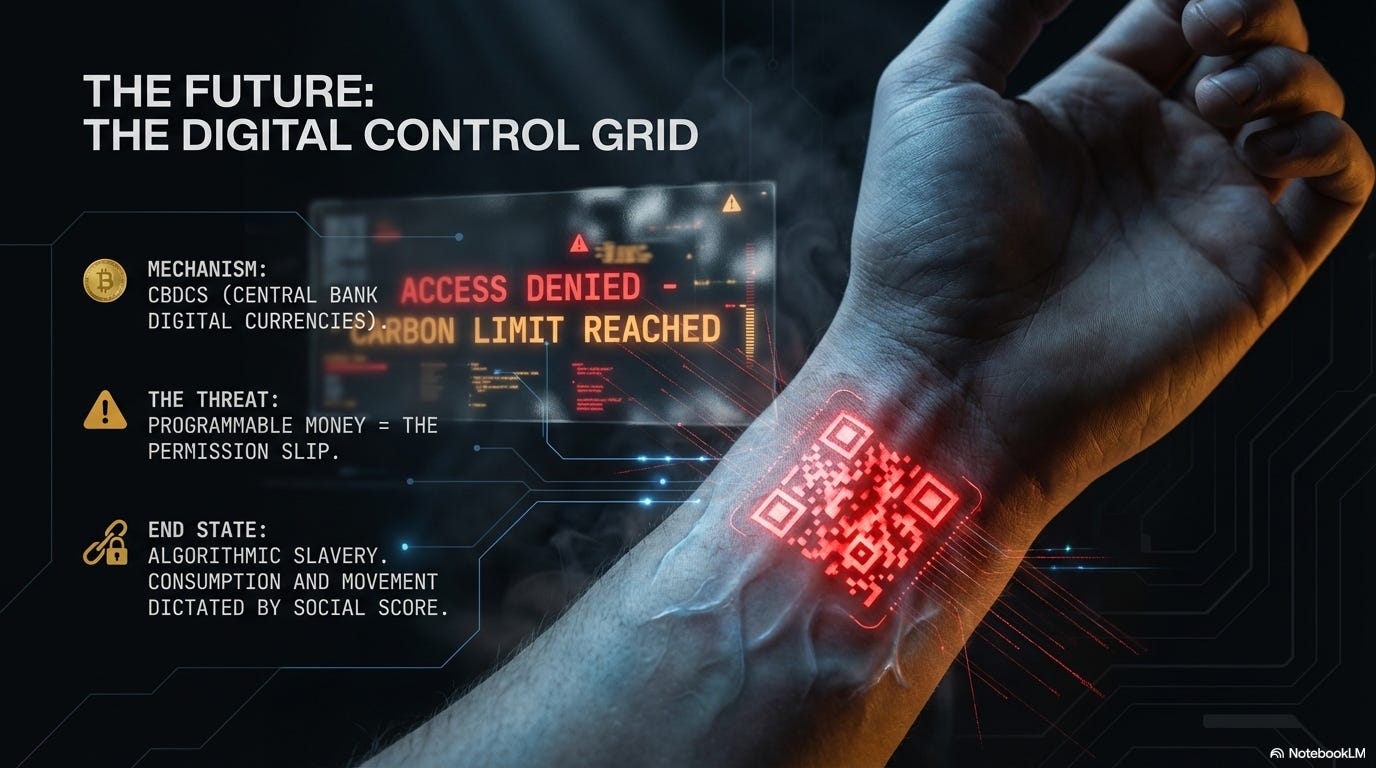Dixon outlines a future built through programmable money, digital IDs, and UBI structures that regulate access, mobility, and transactions. He cites companies such as Palantir as contractors that channel intelligence and surveillance functions into private systems that operate outside traditional government frameworks. Programmable money allows instantaneous directional control of economic behavior without legislative intervention.
