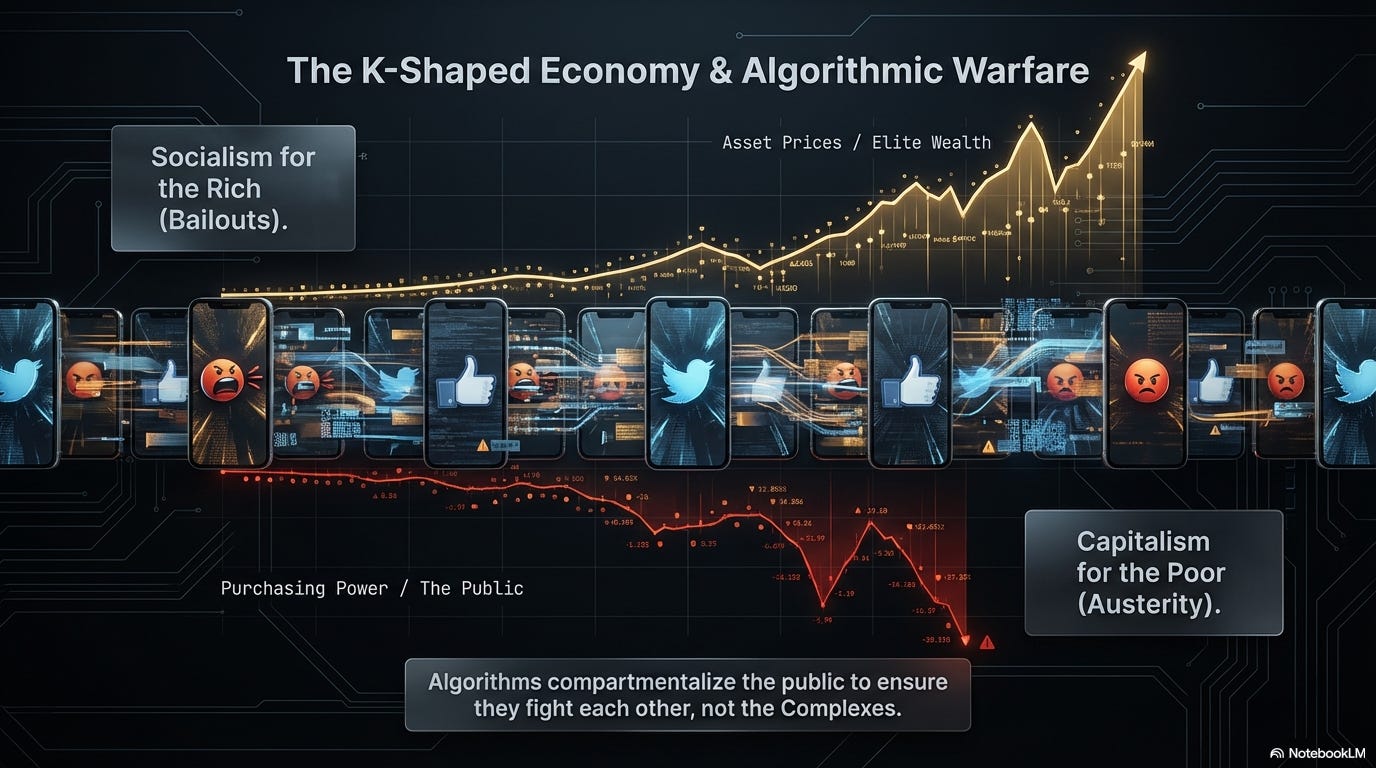 Dixon describes a system of ideological redirection that channels public frustration into rigid identity conflicts. Algorithms accelerate this process by guiding users toward extreme narratives when they search for insight into financial corruption. Dixon identifies X as a honey trap that grants a space for expression while restricting distribution and compiling granular surveillance profiles for future leverage.
