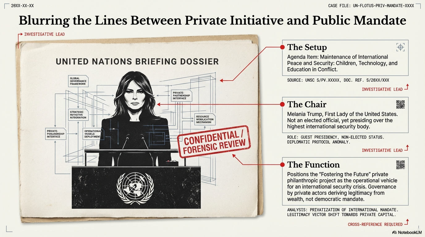 In this podcast, the hosts trace Peter Duke’s article, "The Poster Children of Technocracy," through a March 2, 2026, United Nations Security Council session chaired by Melania Trump and build a detailed account of how the episode illustrates how institutional language, humanitarian urgency, and digital infrastructure converge within a single argument.