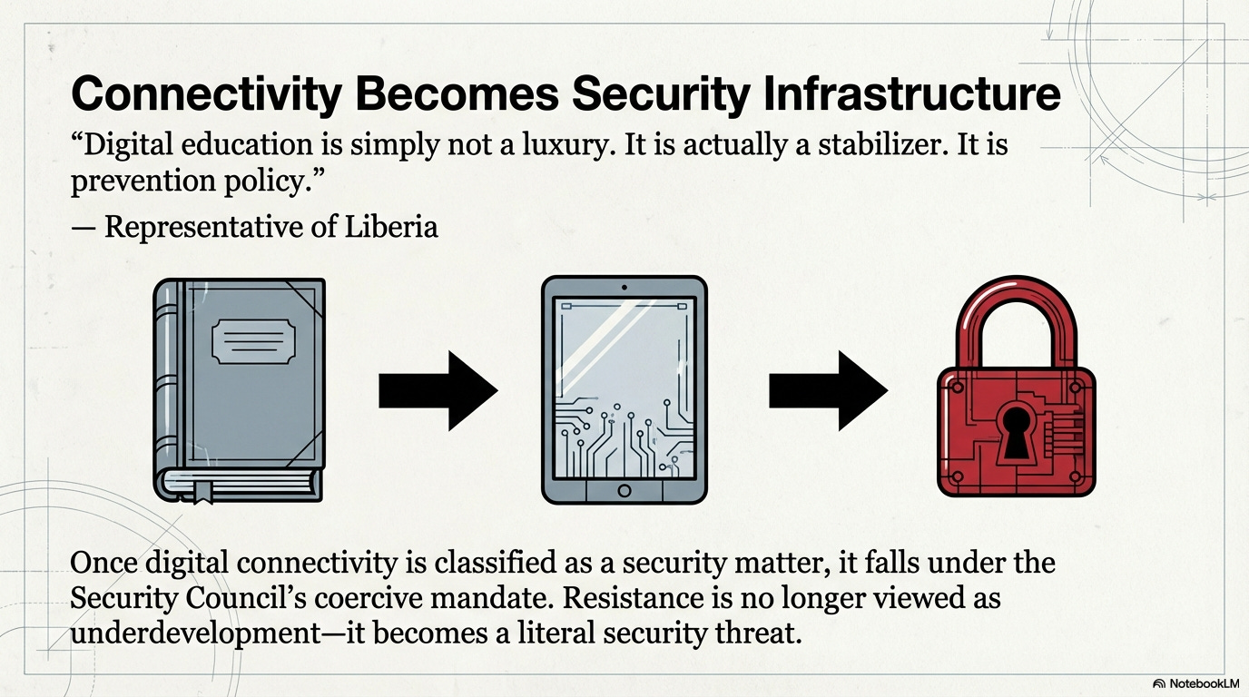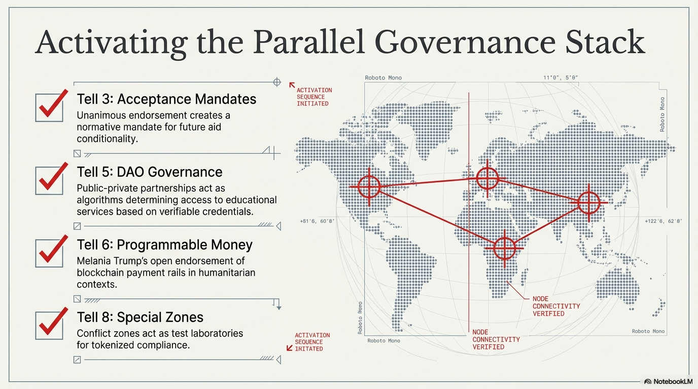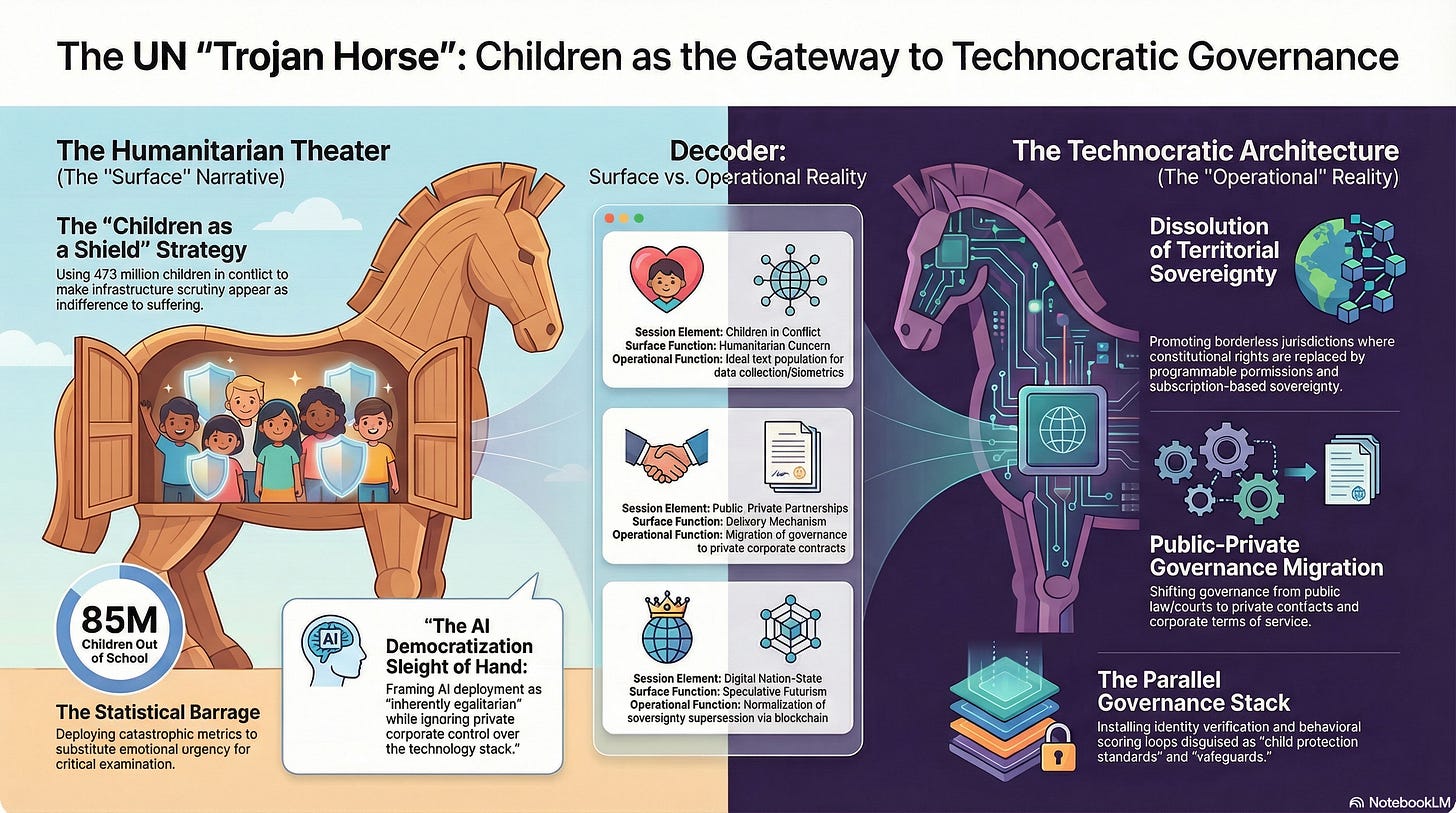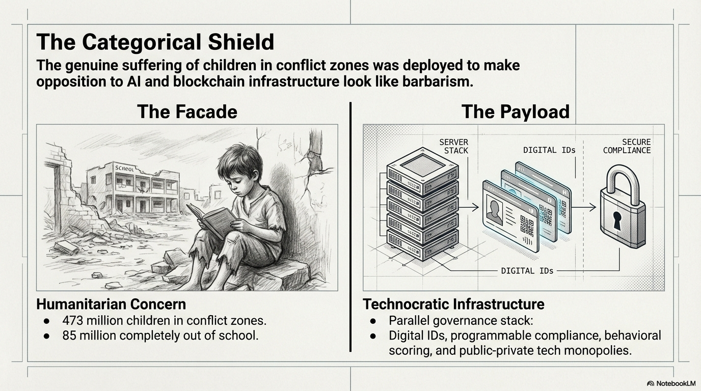 From there, the episode lays out what Turner calls the parallel governance stack: a digital wallet that holds identity, credentials, and assets; tokenized access that governs entry into services and spaces; ambient sensing that captures clicks, location pings, and biometric reads; and reputation scores that convert collected data into compliance rankings. The hosts present that architecture as the culmination of the argument they trace through the transcript. They close by returning to Duke’s question — why children, and why children in war zones? — and answer it through the three functions: the episode names: a categorical shield of sympathy, an ideal test population with little political leverage, and a security frame that elevates connectivity from educational policy into the language of international peace and security.