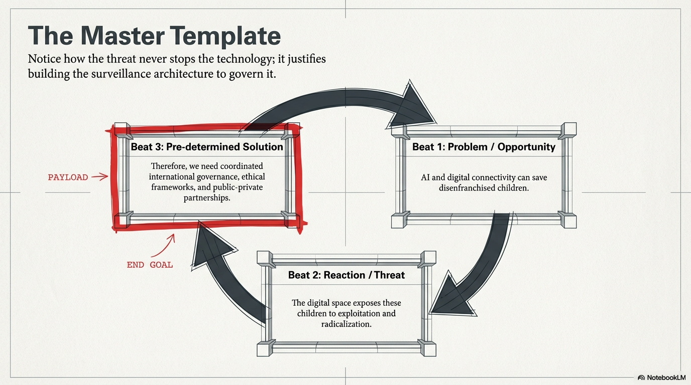 The hosts identify a three-part structure that Duke says appears across the speeches of fourteen delegations. First comes the opportunity frame: technology, AI, and digital connectivity appear as transformative tools for children in conflict zones. Then comes the threat acknowledgment: speakers name radicalization, trafficking, and exploitation as serious dangers inside digital spaces. The final move delivers the governance resolution: delegates call for coordinated international standards, ethical frameworks, and stronger systems to monitor and regulate the technology. The episode treats that sequence as the meeting's operating pattern. Why does that matter? Because the same language that names danger also expands the case for deeper oversight and more data collection.