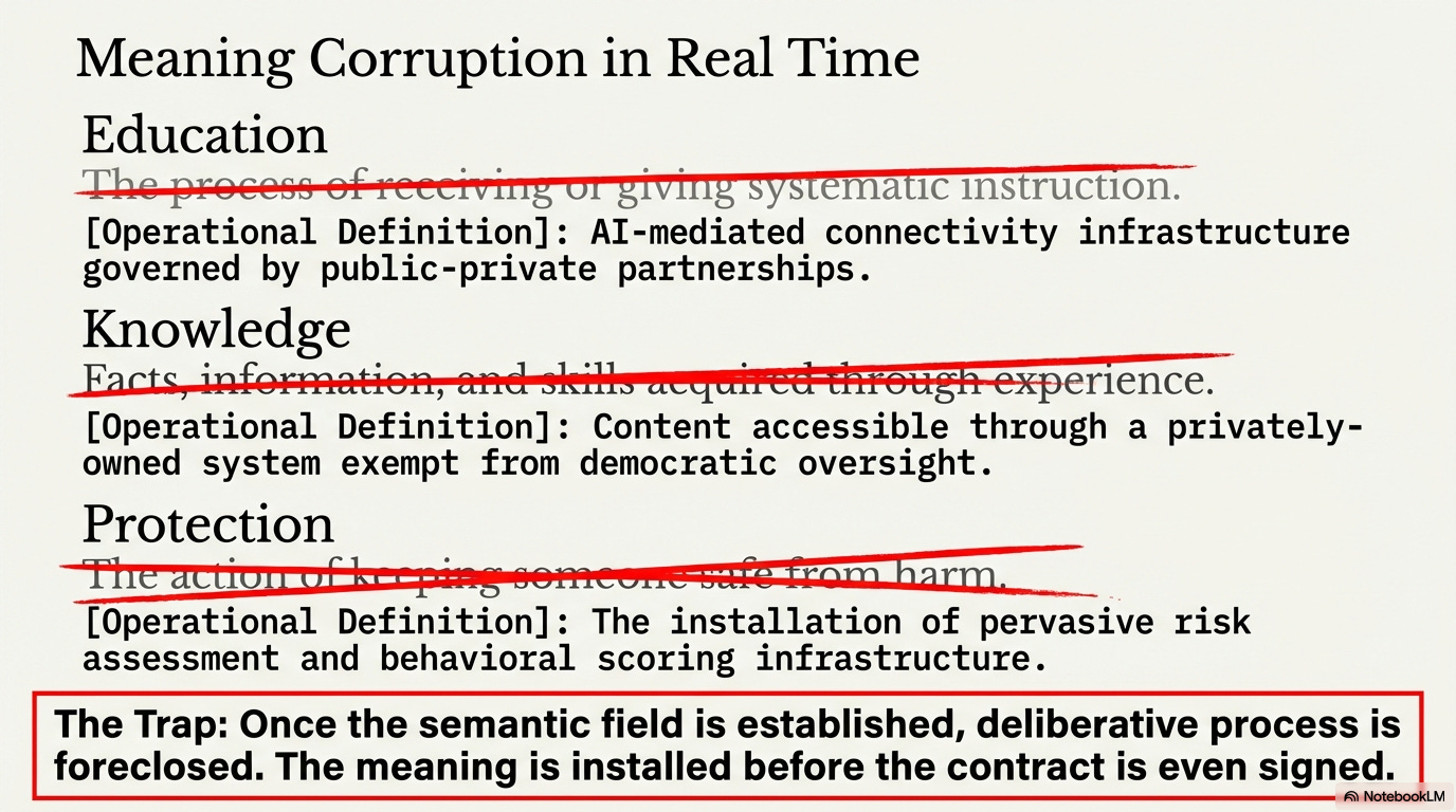 The episode makes Duke’s theory concrete by following his treatment of three words. First, it says the meeting functionally redefines education. In Duke’s reading, education becomes an AI-mediated connectivity infrastructure governed through public-private partnerships. The infrastructure itself carries the meaning. Second, the hosts say the meeting redefines protection. Duke argues that, in this context, protection means behavioral monitoring, data harvesting, and risk-assessment systems that track children in digital environments. Third, the episode examines the phrase democratizing AI. Duke says that phrase masks a transfer of authority to private firms that own the platforms, set the terms of service, curate the knowledge base, and collect user behavior. When the hosts ask who holds power inside such a system, they place Microsoft, BlackRock, and large tech firms in the center of that question.