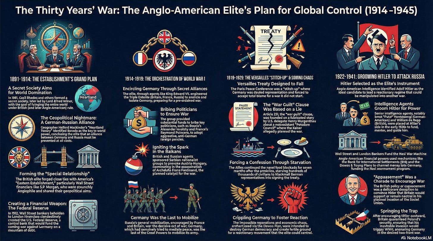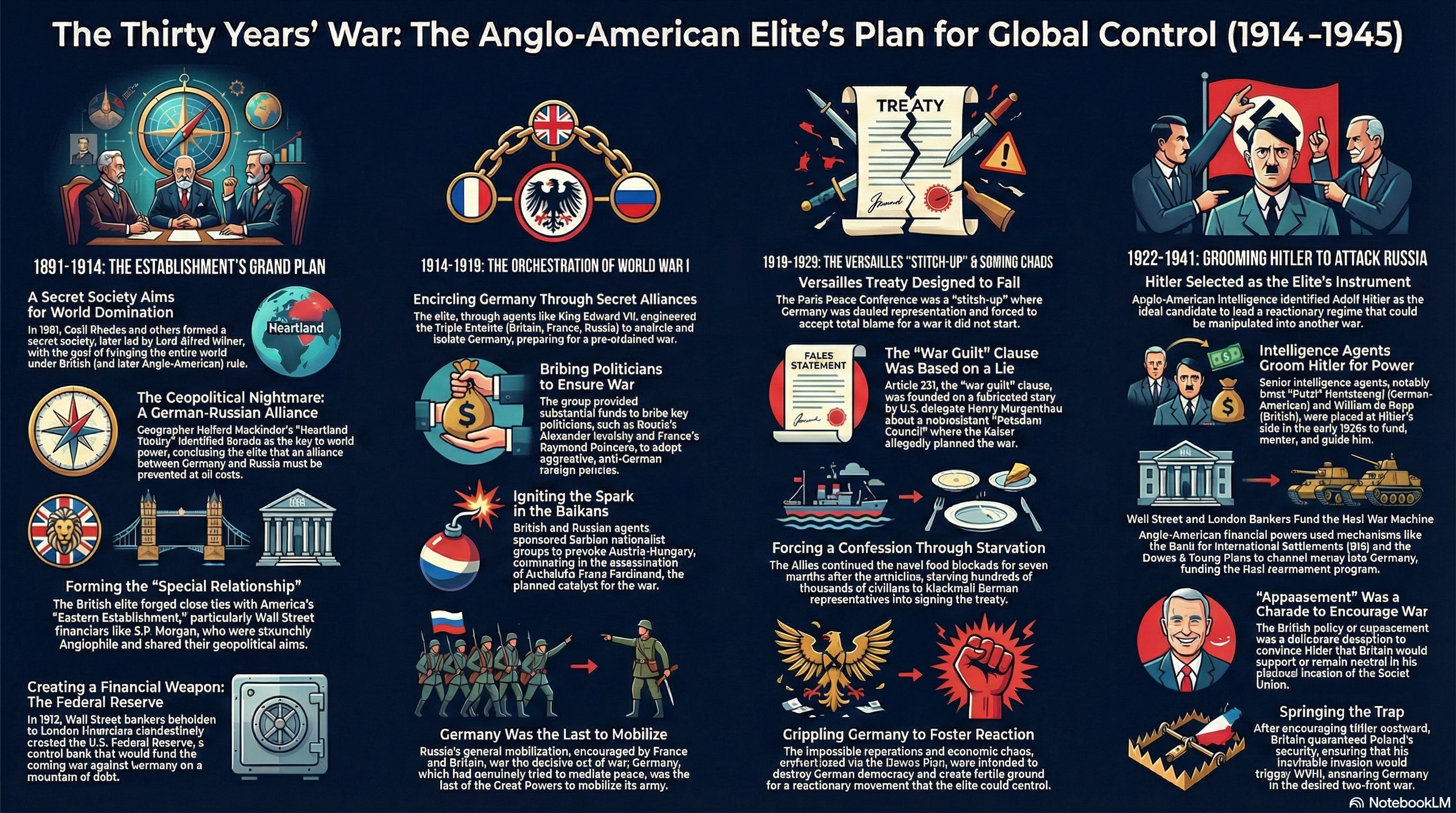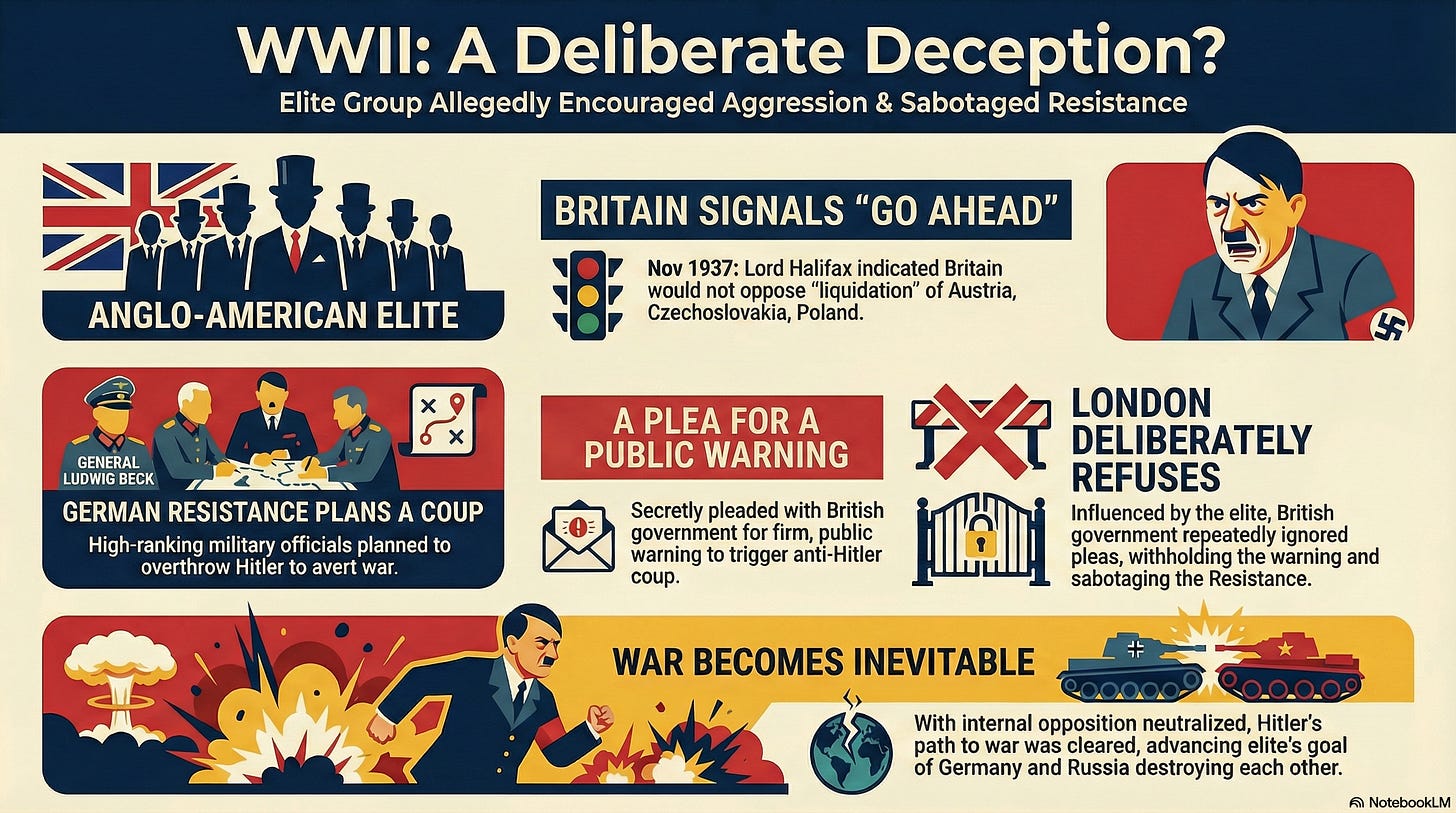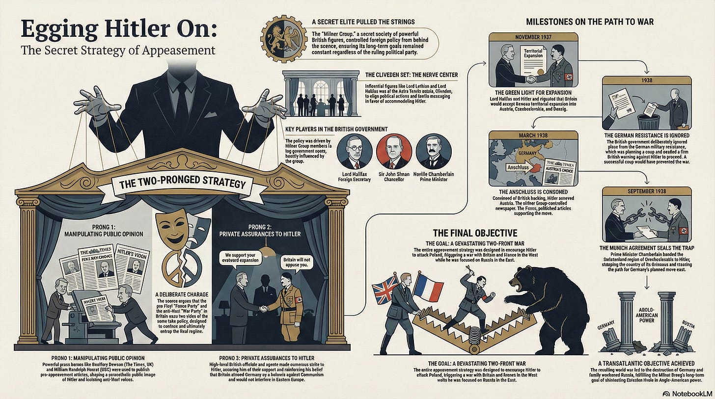 In November 1937, Halifax met Hitler and signaled Britain’s acceptance of territorial revisions involving Austria, Czechoslovakia, and Danzig. German officers preparing a coup required a British warning to legitimize action; the Milner Group withheld it. The coup failed, war followed, and the transatlantic objective—to destroy German and Russian power—advanced to completion.