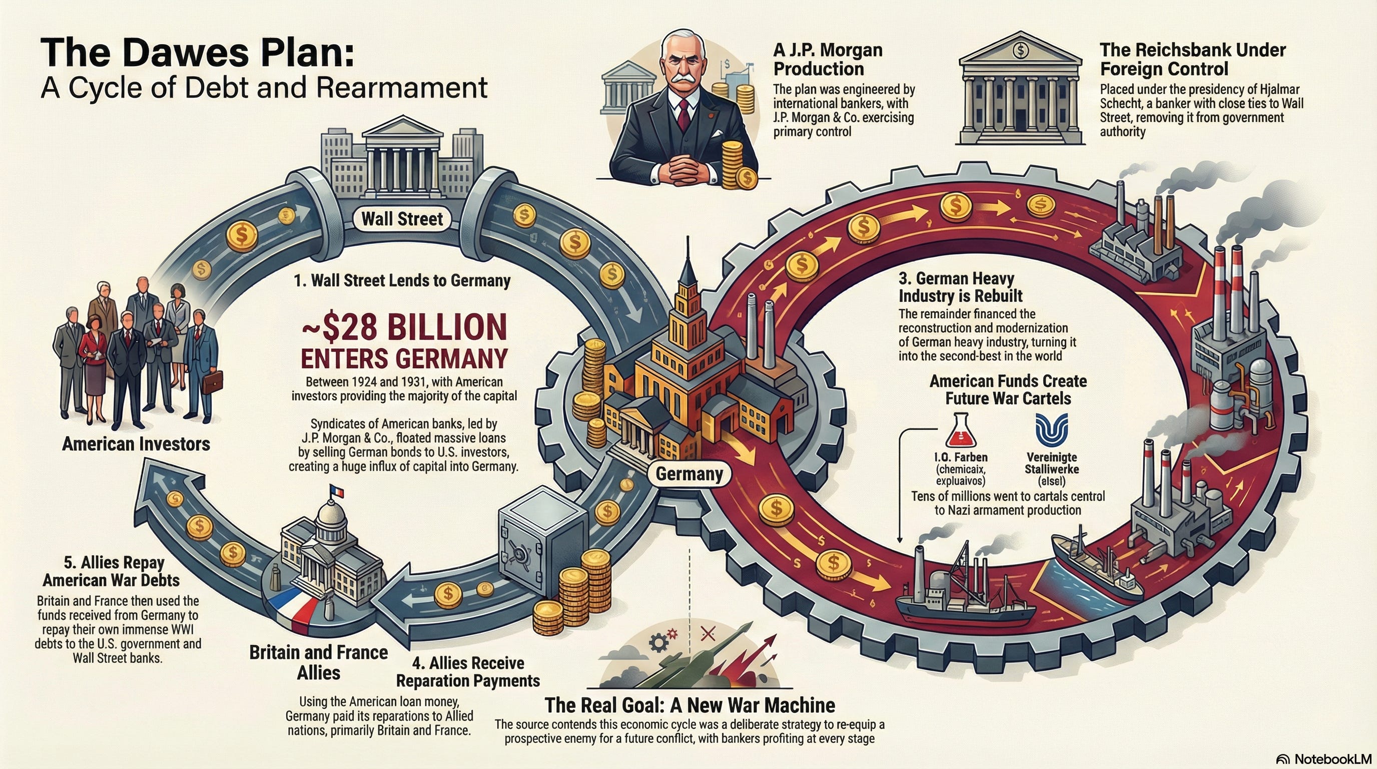 The Dawes Plan of 1924 recycled capital through a self-feeding loop. Wall Street banks lent Germany money to pay reparations to Britain and France, who then used those funds to repay their American debts. Each cycle increased interest obligations. Between 1924 and 1930, approximately $28 billion entered Germany; less than half went to reparations. The remainder financed heavy industry. Companies such as IG Farben and Vereinigte Stahlwerke received tens of millions of dollars and became central to future armament production. The Reichsbank, removed from government authority and placed under Hjalmar Schacht, connected German monetary policy directly to American lenders.