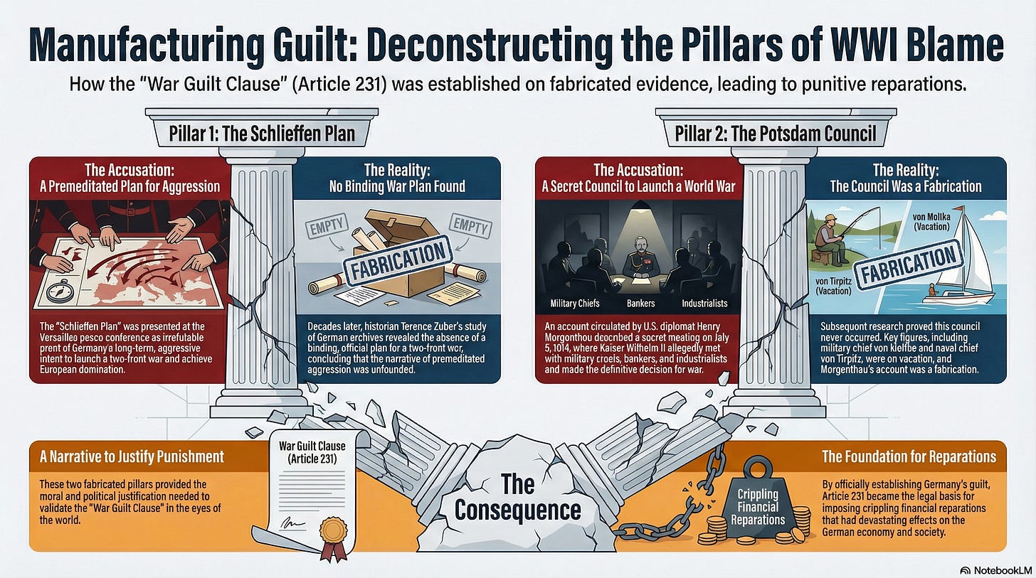 After the war, the peace conference institutionalized blame through Article 231 of the Versailles Treaty. The narrative rested on two pillars: the Schlieffen Plan and the alleged Potsdam Council meeting of July 5, 1914. Historian Terence Zuber’s later study of German archives revealed the absence of a binding two-front war plan, undermining the premise of German aggression. The Potsdam account, first circulated by U.S. diplomat Henry Morgenthau, described a secret meeting where the Kaiser supposedly decided for war; subsequent research demonstrated that such a council never occurred. Yet this fabrication justified reparations and validated the “war guilt” clause.