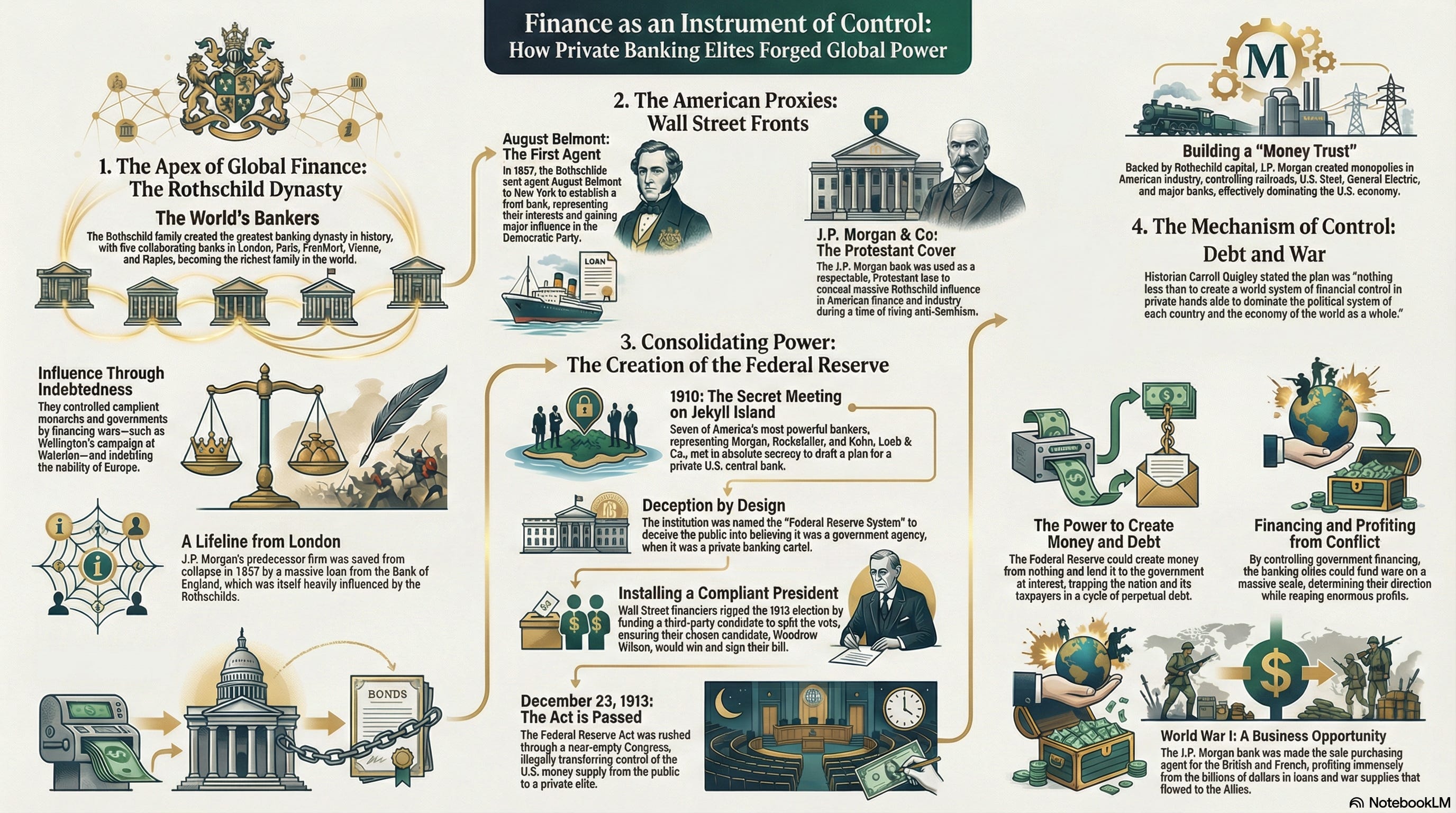 The discussion centers on how the Rothschild banking dynasty expanded its influence through American proxies, including J.P. Morgan & Co. By channeling European capital into American firms, Morgan’s group acted as a front for transatlantic banking interests. The Federal Reserve’s creation in 1913 marked the consolidation of this power. Quigley described the Fed as a private system of financial control capable of directing national economies. By creating credit and charging interest, bankers could finance governments and wars independently of state treasuries. This control over debt positioned them to determine both the scale and direction of conflict.