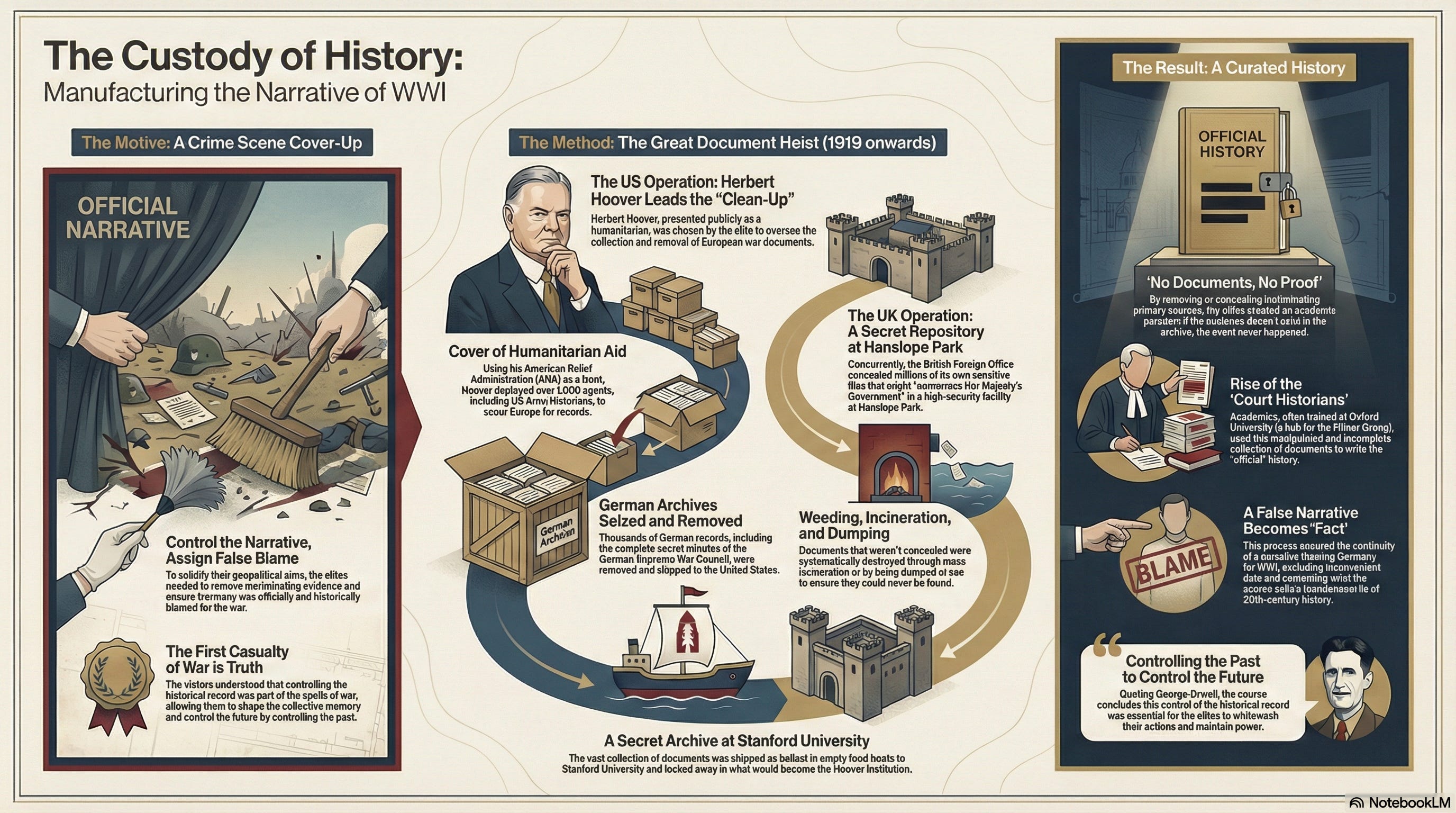 Herbert Hoover’s War Collection, assembled under the cover of humanitarian aid, gathered and removed vast caches of European documents. Thousands of German records, including minutes of the Supreme War Council, disappeared into private archives at Stanford University. The British Foreign Office placed sensitive files at Handslope Park under long-term restriction. These actions shaped the academic record that followed. Official historians, trained within Oxford’s network, wrote from this curated evidence, ensuring continuity of narrative and exclusion of inconvenient data.