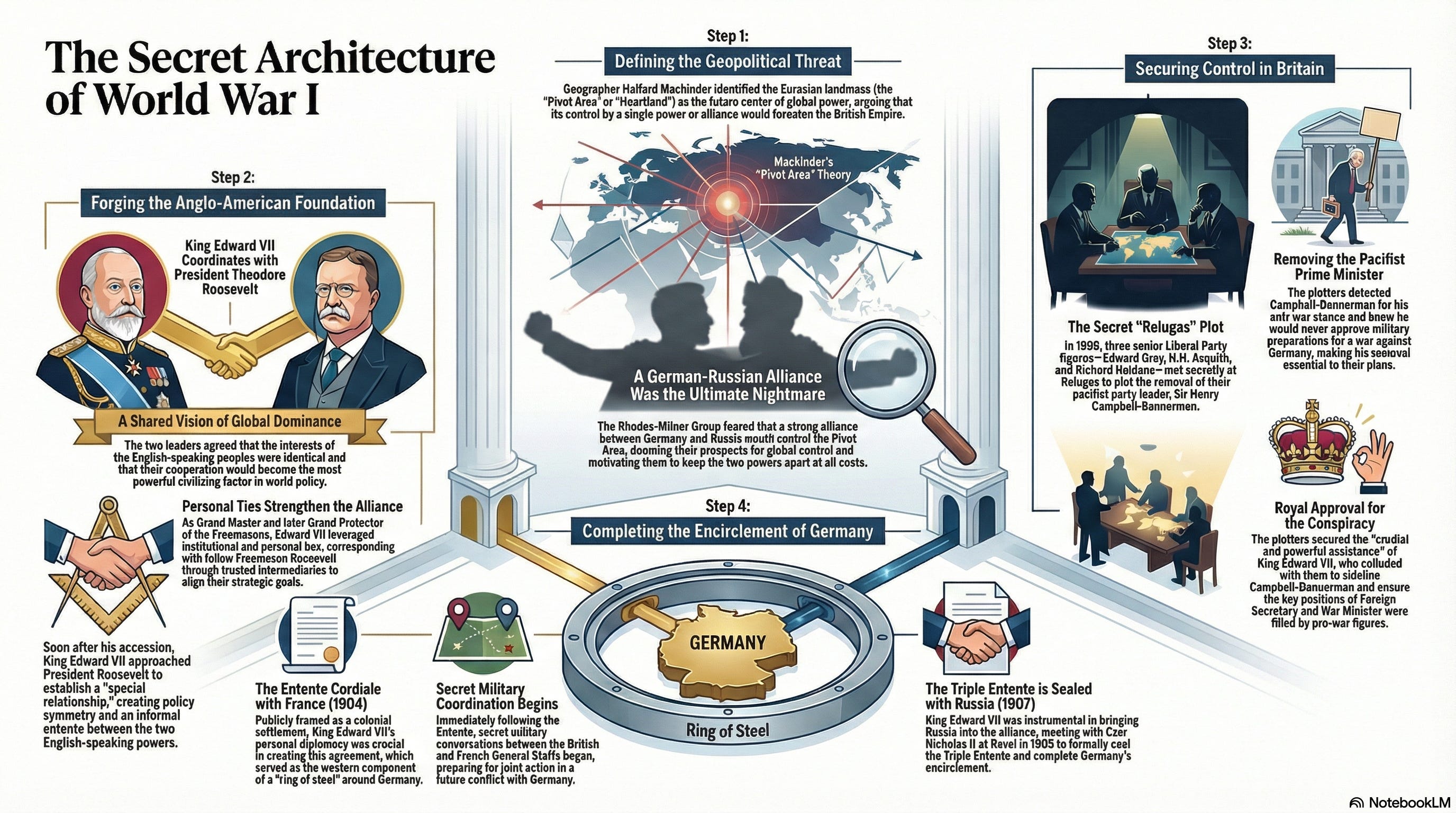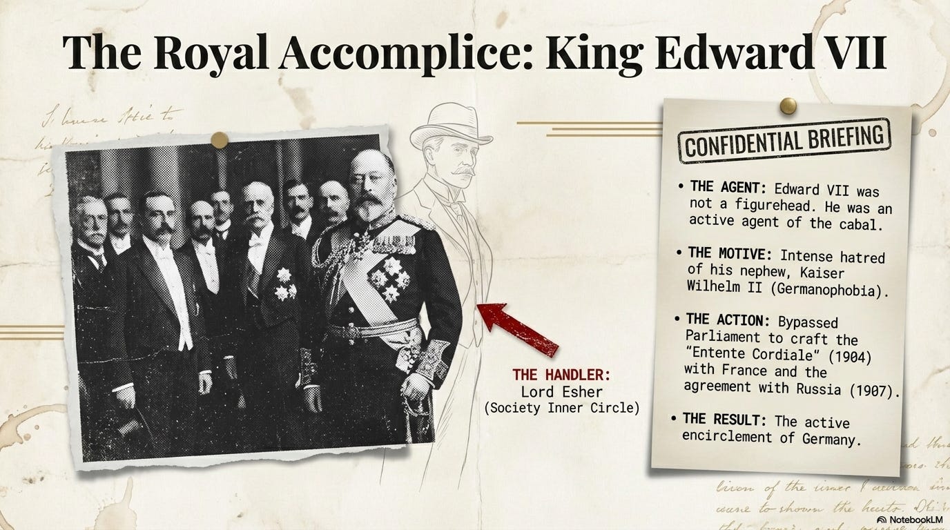 King Edward VII emerges as a central figure in the prewar alignment. As Grand Protector of the Freemasons, Edward leveraged personal and institutional ties to forge alliances against Germany. His coordination with U.S. President Theodore Roosevelt established policy symmetry across the Atlantic.