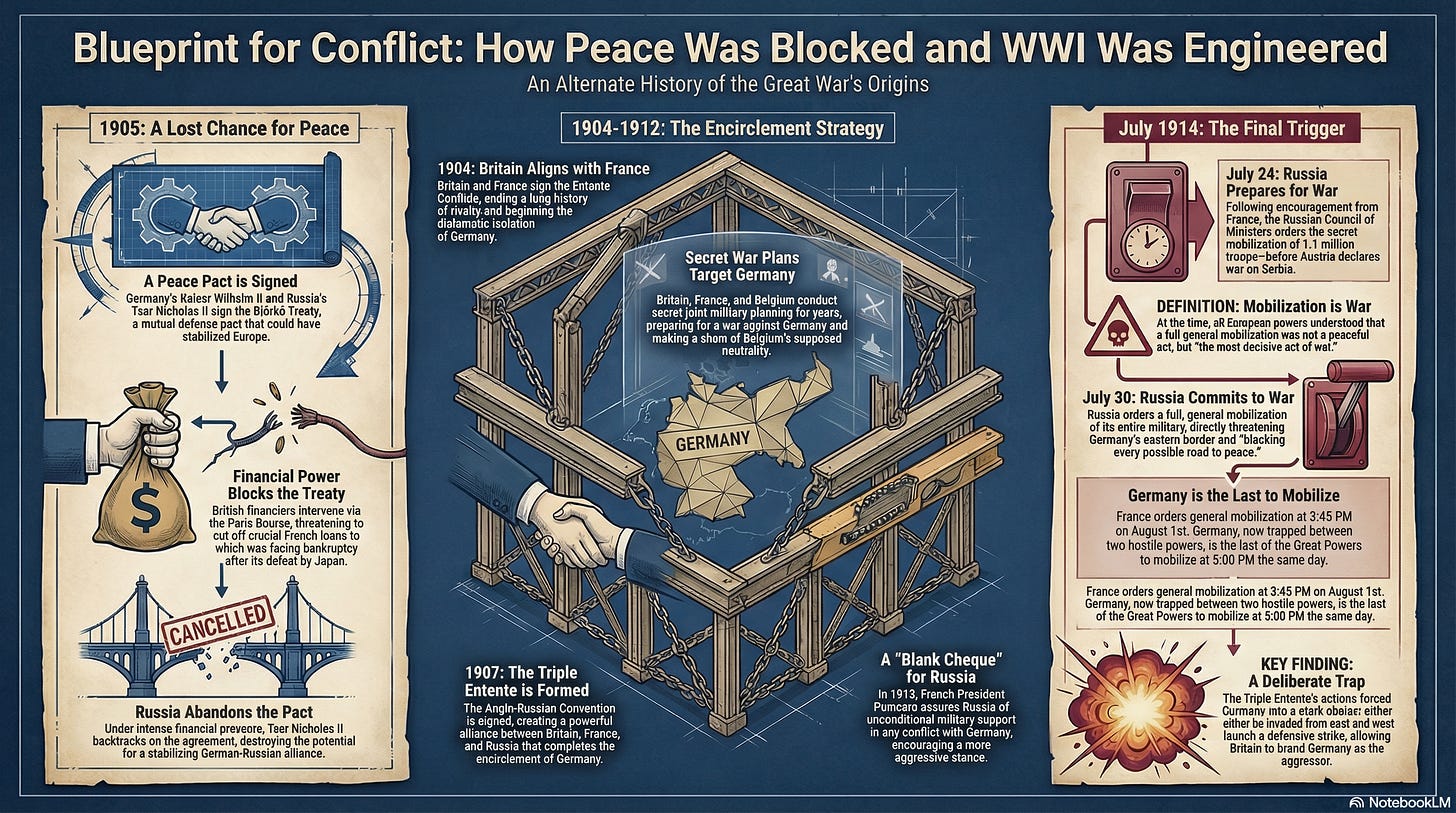 When Kaiser Wilhelm II and Tsar Nicholas II signed the Björkö Treaty in 1905, they sought a mutual defense pact that might have stabilized Europe. According to the book, British financiers intervened through the Paris Bourse, threatening to halt French loans to Russia. Facing bankruptcy after defeat by Japan, Russia abandoned the treaty. By 1914, Britain and France had diplomatically encircled Germany. The Russian general mobilization of July 30, 1914, then triggered a chain of declarations that transformed local conflict into global war. The Deep Dive discussion highlights how this mobilization, more than any single assassination or invasion, initiated the cascade.