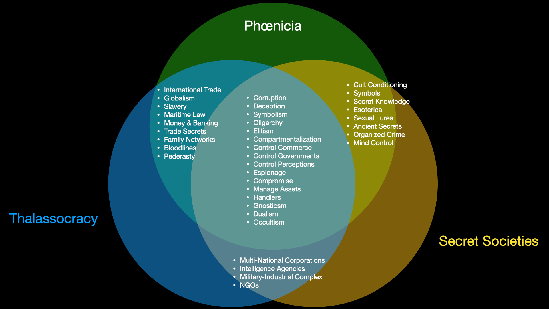 Duke and Mrs. Heritage History close by tracing a historical sequence from Phoenicia to Carthage, the Venetians, the Dutch, the British, and contemporary Anglo-American finance. She asserts that this line of continuity demonstrates the persistence of a maritime oligarchy whose cohesion depends on secrecy and intermarriage. The Phoenicians, she concludes, never ruled a single nation. They built a network of ports that governed through trade, information, and cultural absorption. Their descendants, she believes, operate through modern institutions that mirror their ancient model — a hidden sea power sustained by ritual, intelligence, and commerce.