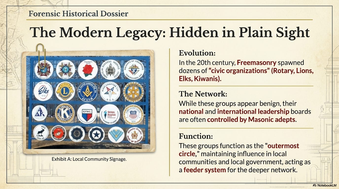 This is not to say that every community organization in every town in the USA is a full-fledged Masonic secret society. But many common civic groups with Masonic roots (Rotary Club, Lions, Elks, etc.) have national or international leadership boards that are almost certainly controlled by Masonic adepts.