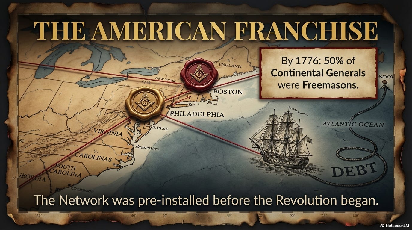 Freemasonry arrived in Philadelphia in 1730 and in Boston in 1733. By the 1750s, there were dozens of lodges, and by the time of the Revolutionary War, about half of Washington’s generals were Freemasons.