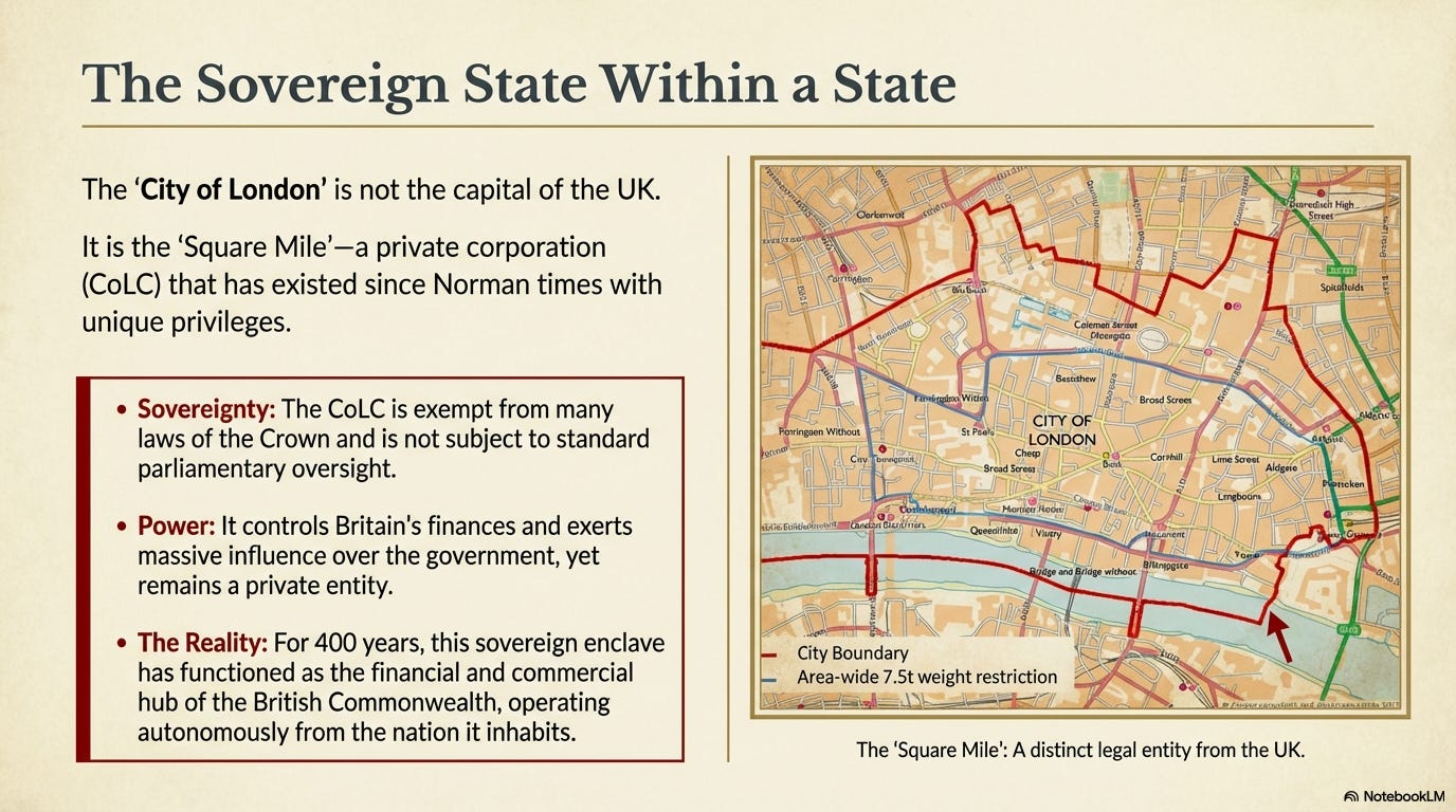 In other words, the City of London Corporation controls Britain’s finances, governs its empire, and exerts enormous influence over its government, but it is not subject to the laws of Britain. And its special status is scarcely mentioned in most histories.