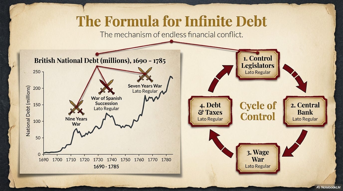 This gave Parliament a permanent credit line, enabling England to continue a twenty-five-year war with France (1688 to 1713). And it created the “National Debt” and a permanent source of income for British Bankers.