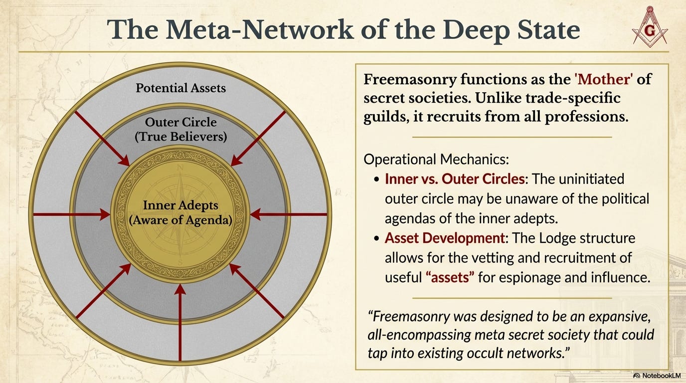 It seems that Freemasonry was designed to be an expansive, all-encompassing “meta” secret society that could tap into existing occult networks and generate new ones. Freemasonry, in fact, was notorious for spawning new secret associations, especially revolutionary political and military societies during the 19th century.