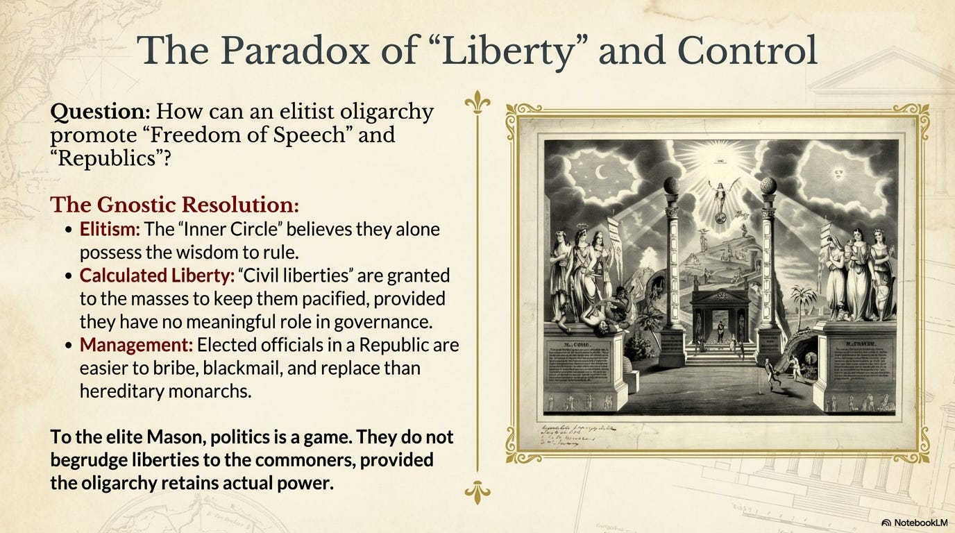 To a high degree, among Freemasons, there is no conflict between the ideals of representative government and oligarchy. Their philosophy is elitist and Gnostic, meaning that those who possess occult knowledge are above the fray and above reproach. The Masonic oligarchs and their minions believe they are entitled to rule, that they alone have the wisdom to rule, and that they do not begrudge civil liberties granted to commoners, as long as those commoners have no meaningful role in government. If the hoi polloi believe they are free from tyranny, all the better.