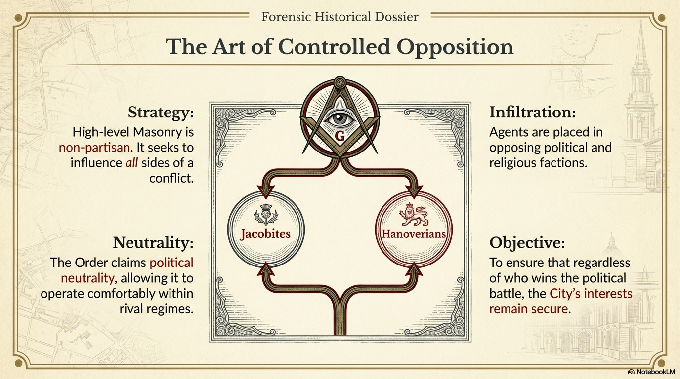 However, there is no conflict between the Jacobite cause and Masonry because, as we have seen, higher-level Masons are Gnostics, not political partisans. The purpose of Masonry is to influence all sides of the political and religious spectrums, whether by affiliation, espionage, or “controlled opposition”—all the while serving the interests of the oligarchs. This is why Freemasonry presents itself as politically and religiously neutral. Sometimes the best way to promote the oligarchs' interests is to pretend to oppose them.
