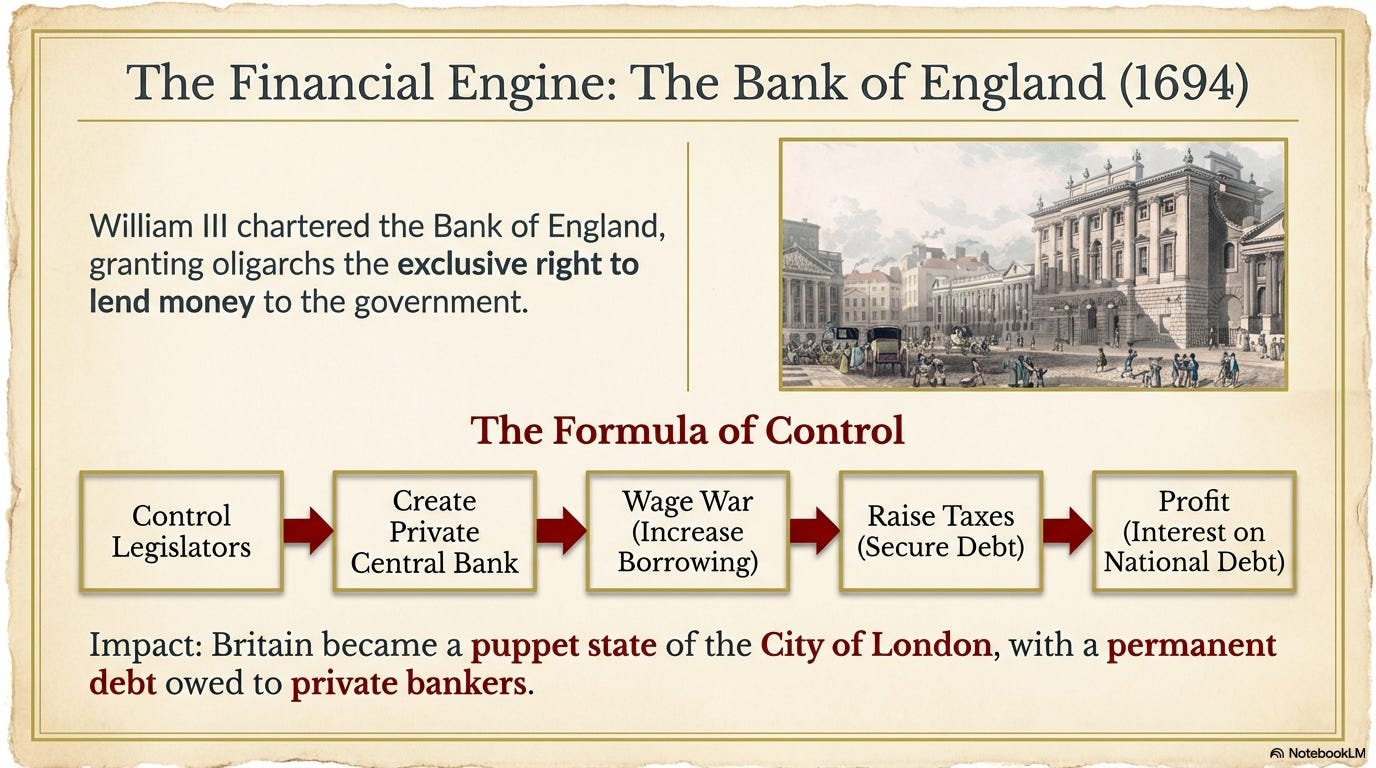 And the Bill of Rights was just the start. As soon as Parliament had the authority to raise taxes, William III secured financing to continue his War with France and put Parliament into debt. Then, in 1694, he chartered the Bank of England, giving London oligarchs the exclusive right to lend money to parliament.