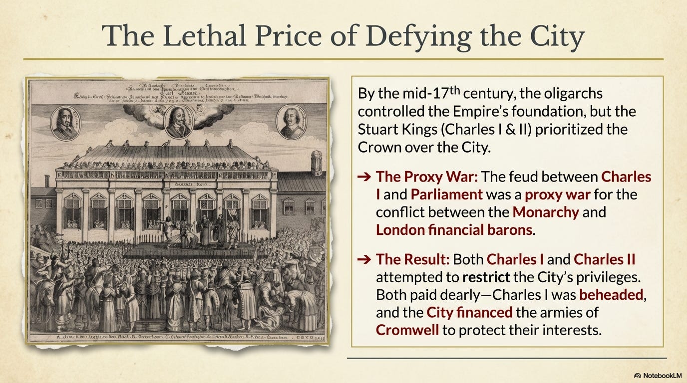 By the mid 17th century, City of London oligarchs controlled a worldwide network of trading ports that formed the foundation of the British Empire. But under Charles I, they no longer had a monarch who prioritized their interests above all other considerations. However, many members of the king’s Parliament had connections to the City, and the two-decade feud between Charles I and Parliament was a proxy war for the ongoing conflict between the monarchy and London financial barons. And it was a perilous feud. Both Charles I and Charles II tried to restrict the privileges of the City of London, and both paid with their lives.