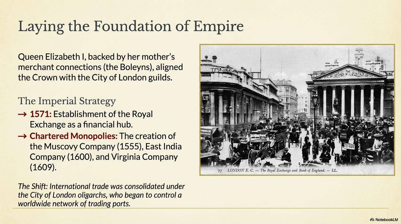 In 1571, Elizabeth helped establish London as a trading center by instituting the Royal Exchange, a financial and commercial hub in the heart of the City. And over the following decades, she chartered several important joint-stock trading companies, owned primarily by the wealthy London merchants. This was significant because in previous centuries, international trade with Britain was mostly controlled by foreign companies.