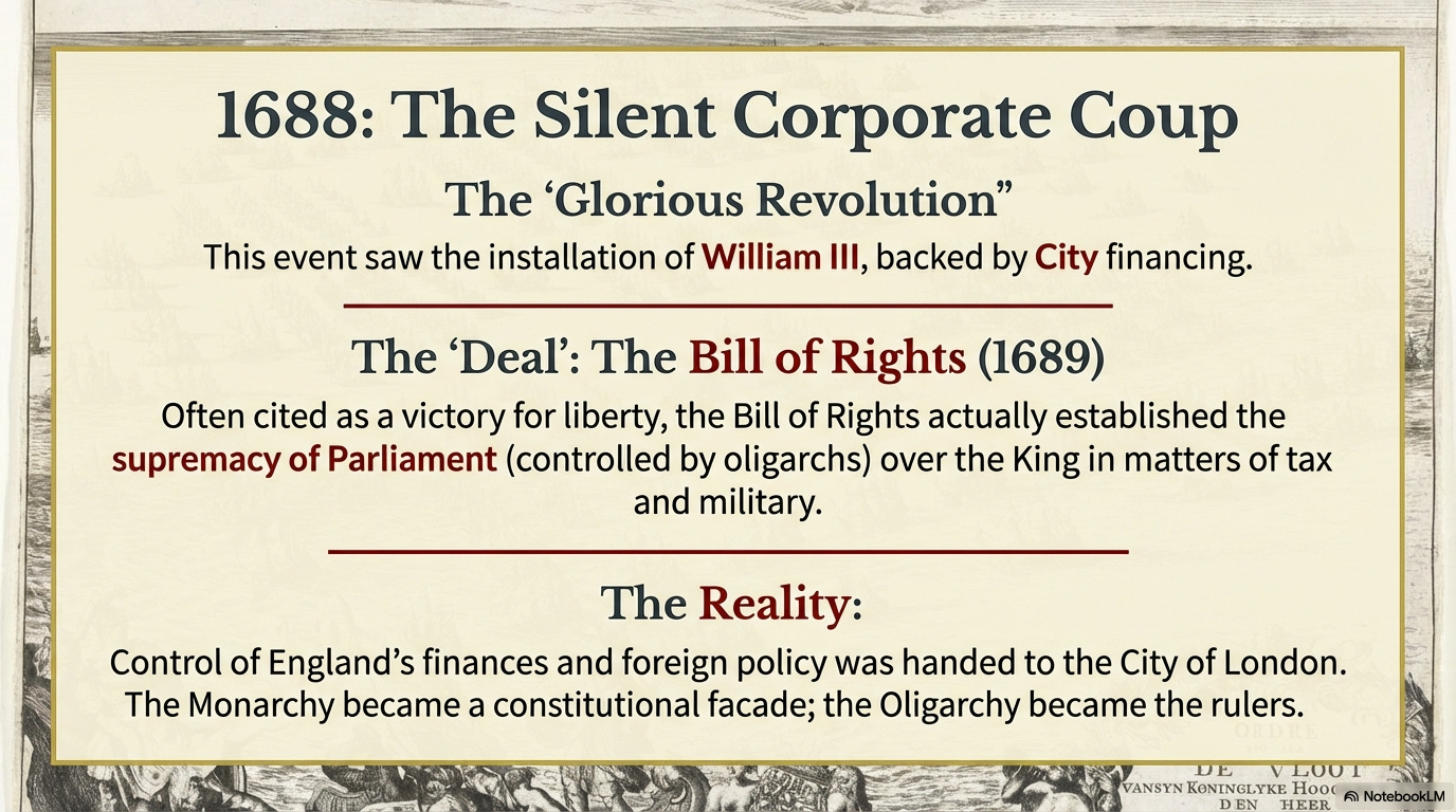 The bill removed all power over finances from the king and is presented in history books as a decisive blow against tyranny. But in reality, it handed over control of England’s finances and foreign policy to City of London oligarchs, who had already bought, bribed, or blackmailed most of Parliament.