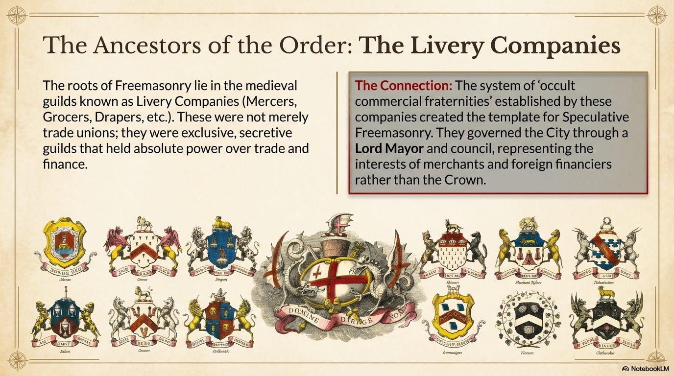 The Livery companies of London were exclusive, secretive guilds that held all power over trade and finance in England. And it was this medieval system of occult, commercial fraternities that speculative Freemasonry emerged from.