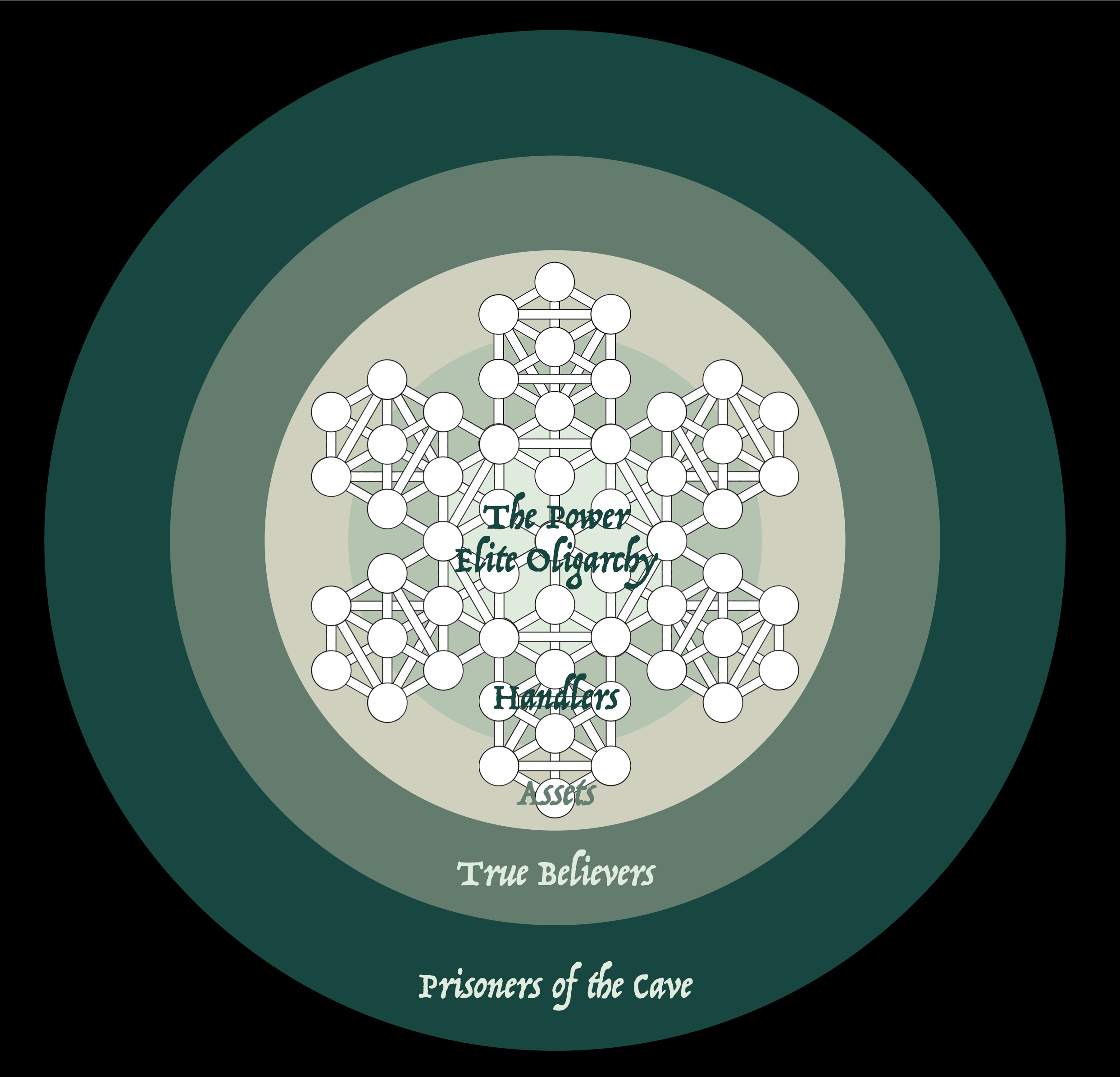 The structure's labels are not original to this work or author. Prisoners of the Cave comes from Plato’s Republic, True Believers from Philosopher Eric Hoffer’s book of the same title, Assets and Handlers (or Controllers) are standard Intelligence Community (IC) terms, and the Power Elite comes from the work of sociologist C. Wright Mills, from his book of the same title.