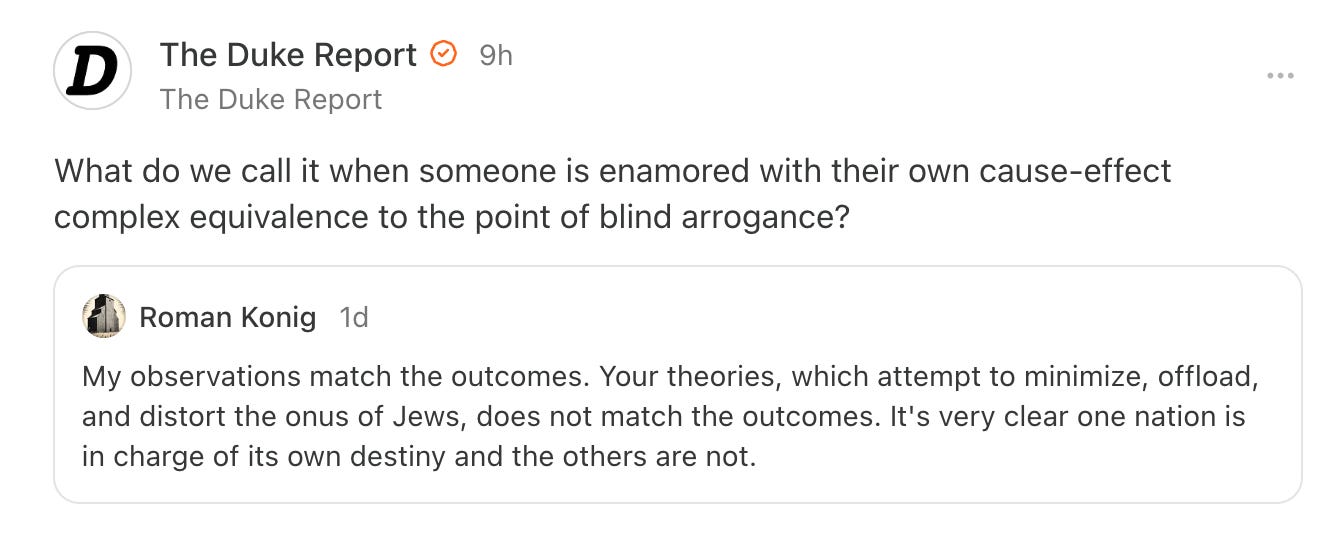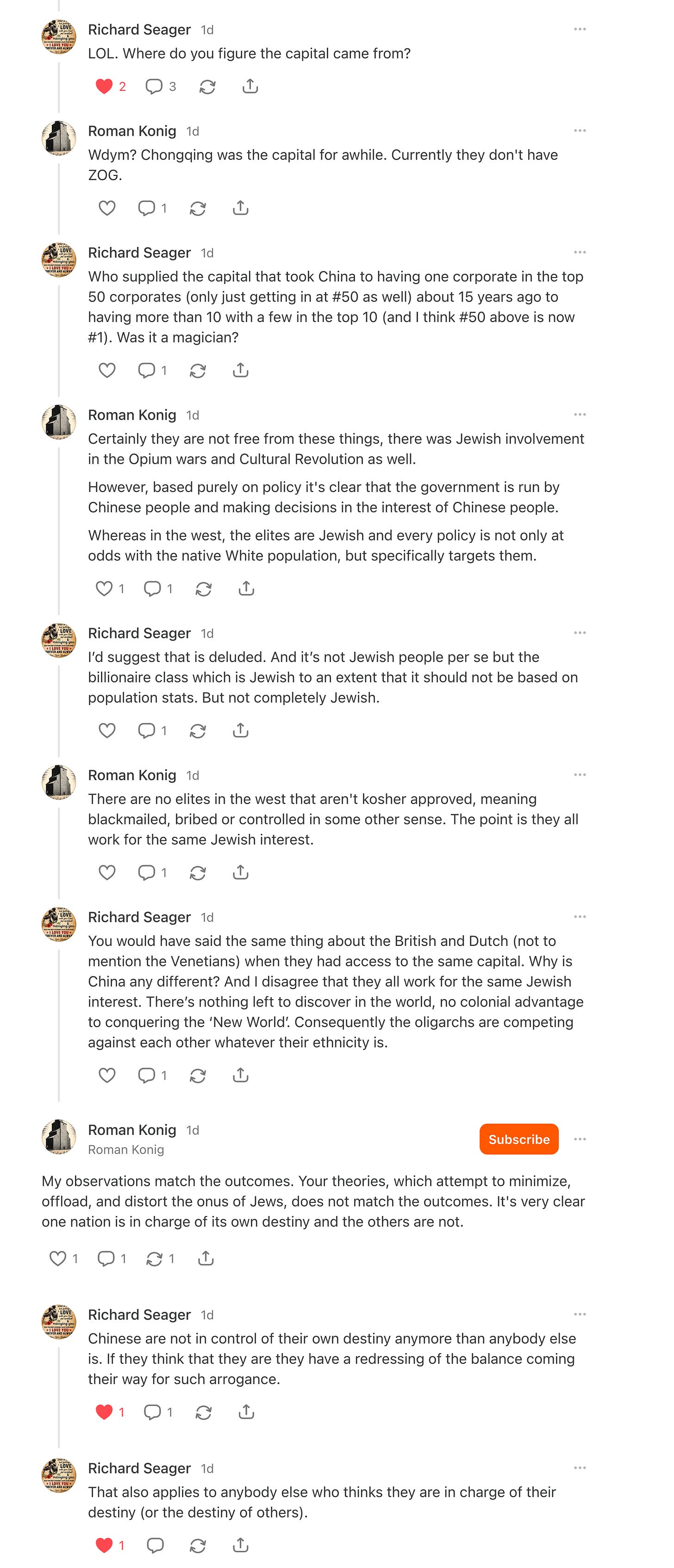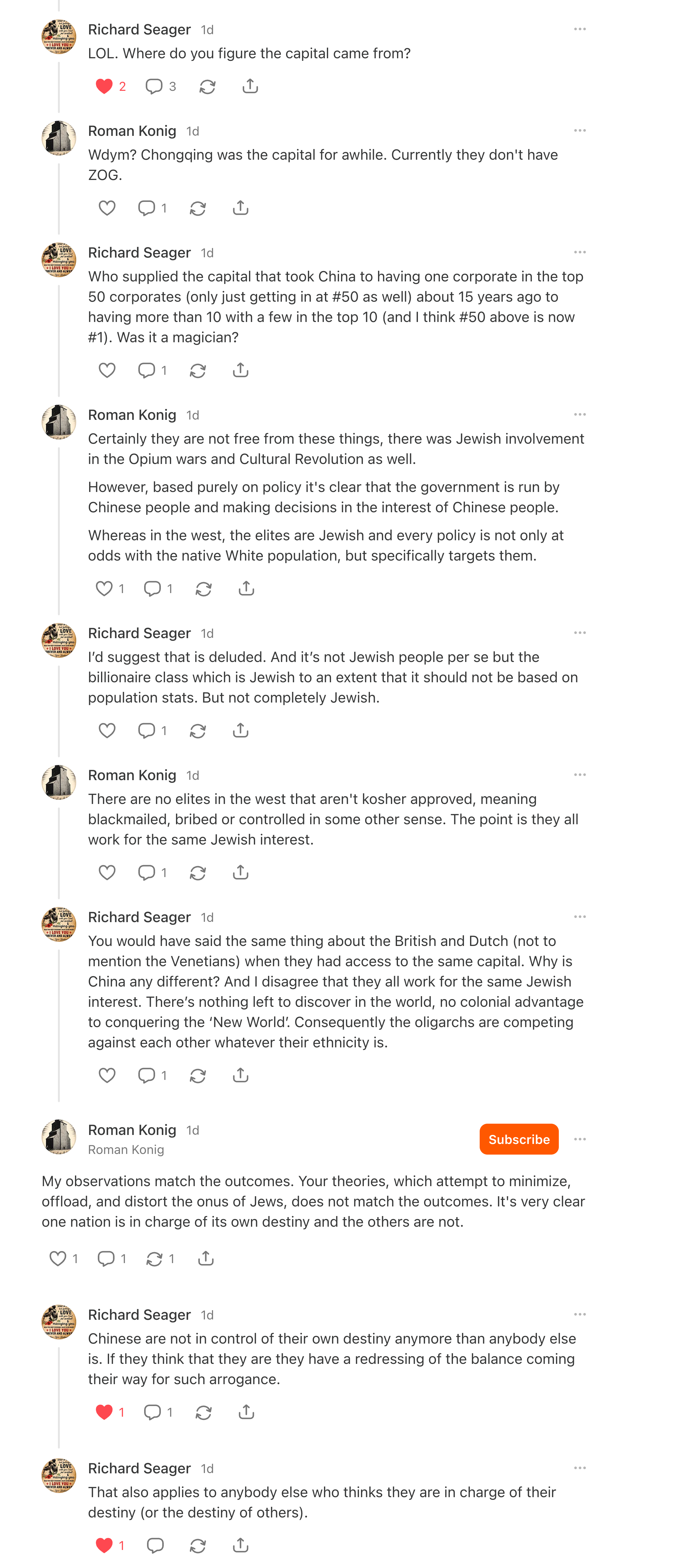 SubStack is usually a cut above Twitter, insofar as comments go, but today I saw a thread that gave me pause, between “Roman Konig” and Richard Seager.